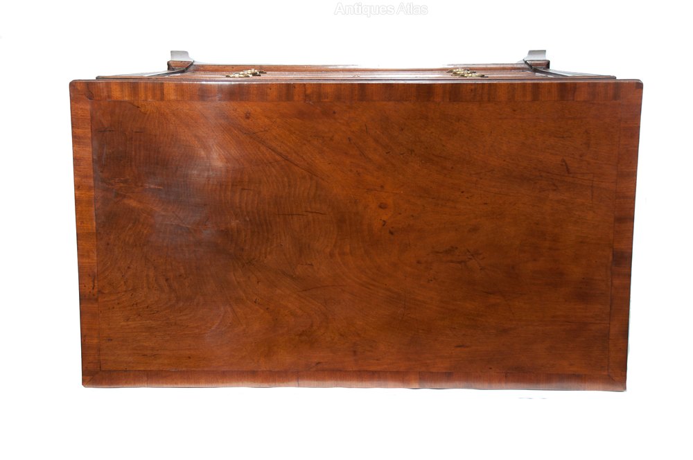 The rectangular mahogany top having a crossbanded border and moulded edge over a long drawer above three shorter drawers. All drawers being oak lined with a crossbanded border and cockbeaded edge retaining their original brass escutcheons and locks with each having a pair of solid brass hexagonal ring handles which are later. These are old handles having been on the chest since the late 19th Century.