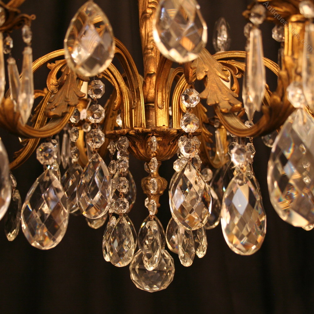 An Italian gilded cast brass and cut glass 8 light chandelier, the Acanthus leaf reeded rectangular gauge scrolling arms with cast pierced drip pans and foliated candle sconces, issuing from a foliated central column and scrolling top canopy, decorated overall in faceted crystal cut glass double pear pendants and having the original chain and ceiling rose, super patination. Fully rewired and PAT tested. All our chandeliers come with ceiling fixings and spare bulbs.