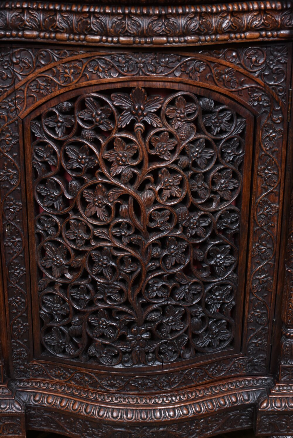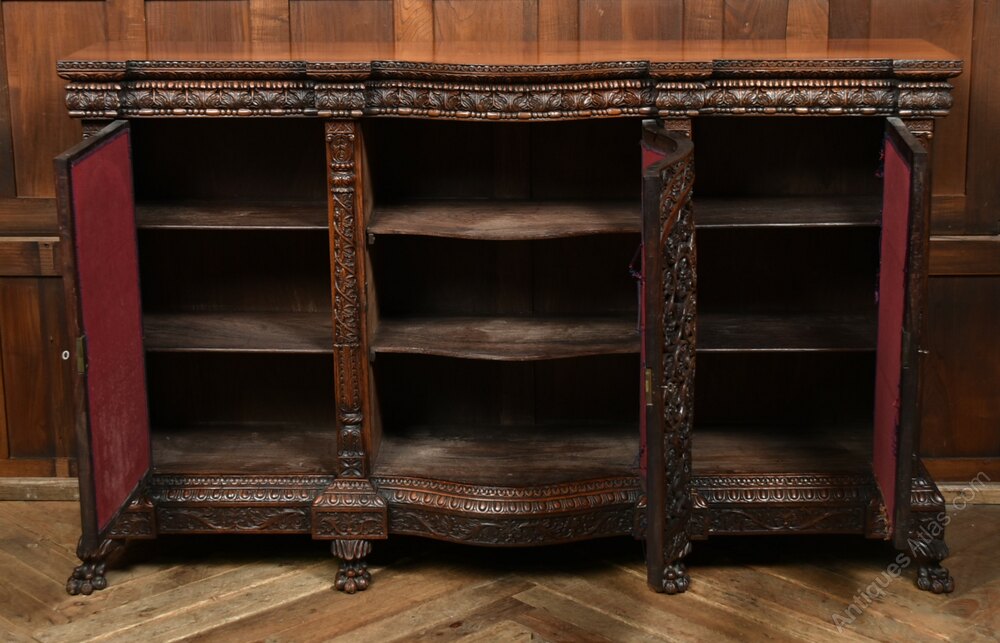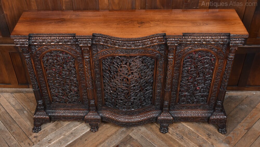 A superb Anglo-Indian sideboard crafted from richly grained Padouk and presented in excellent condition, complete with three working keys. The front showcases three arched panels, each intricately carved and pierced, backed with red fabric that can be easily removed or replaced to suit your interior palette. The central panel is gently bow-fronted. Resting on robust claw feet, this commanding piece offers generous storage while serving as a striking focal point. Its fusion of Indian artistry and British colonial design makes it a versatile addition to hallways, dining rooms, or drawing rooms where craftsmanship and heritage are celebrated. With its elegant proportions and decorative detailing, the sideboard also lends itself beautifully to modern living, perfectly suited to sit beneath a flat-screen TV, discreetly housing consoles and media boxes while allowing remote access through the pierced panels. A truly impressive piece, this sideboard brings both character and functionality, elevating any space it inhabits.