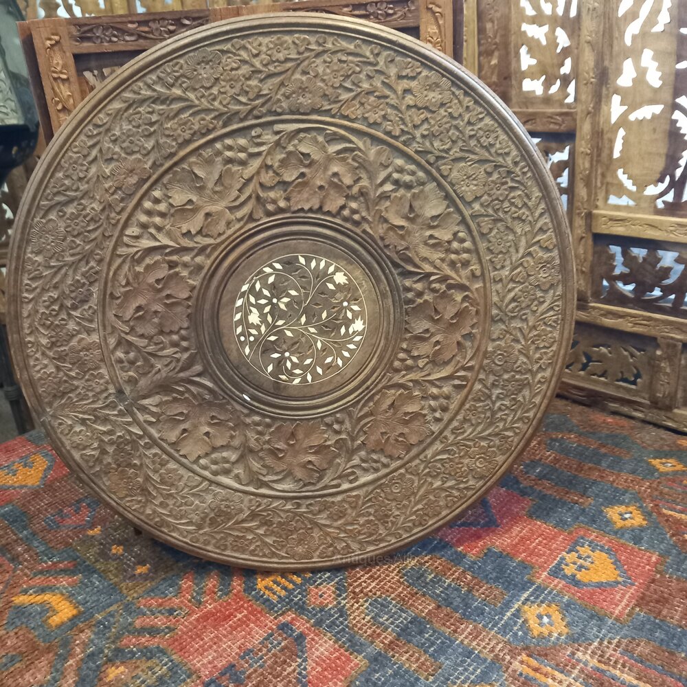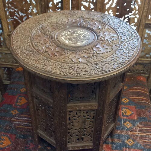 A good Anglo Indian folding side table. With carved fretwork panels to the sides and a carved top with decorative bone inlay, there are some losses to the inlay which is quite common with this style of table but it dosn't distract in any way. The overall condition is very good.