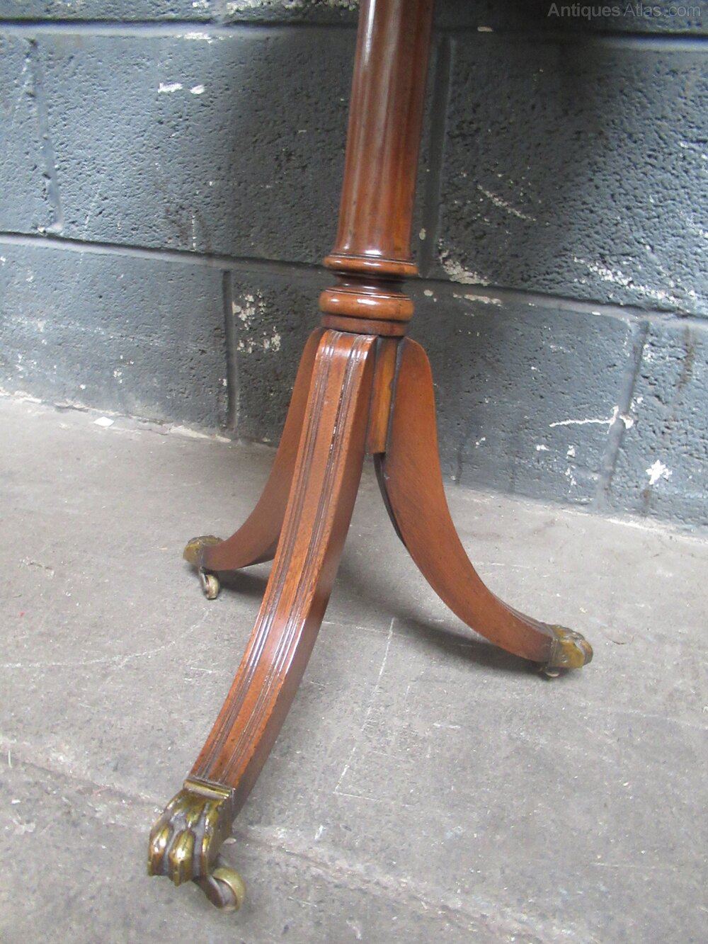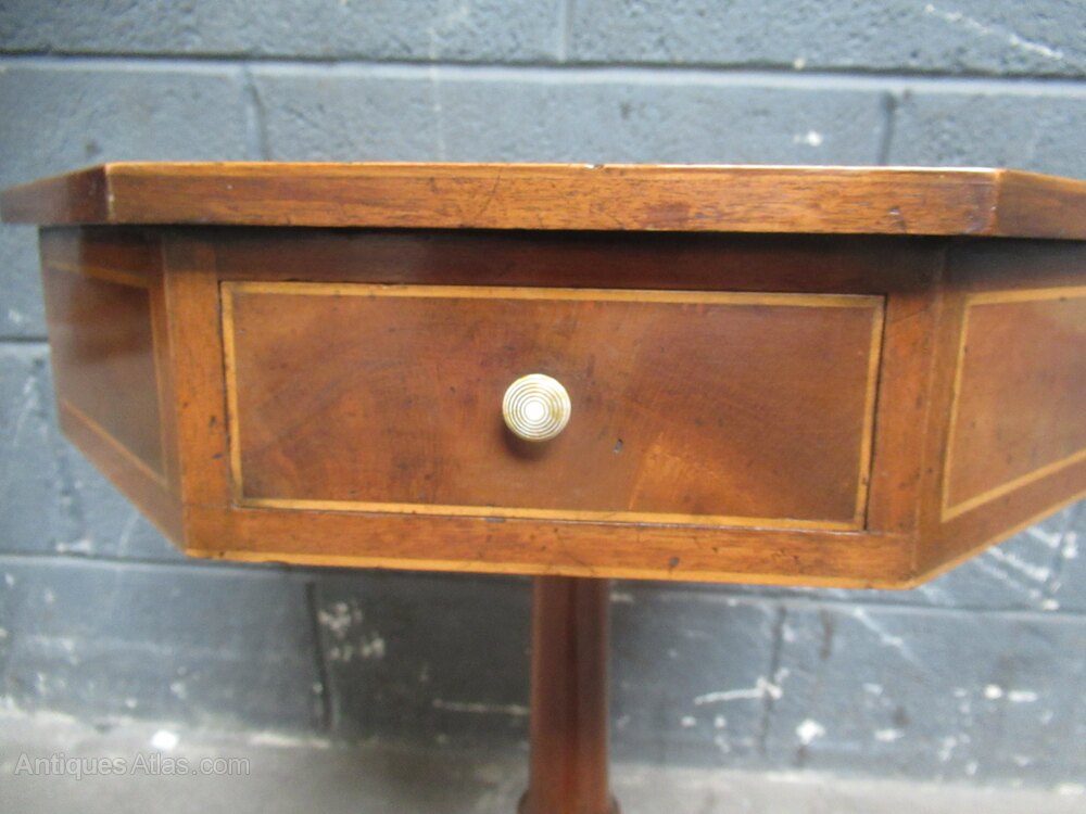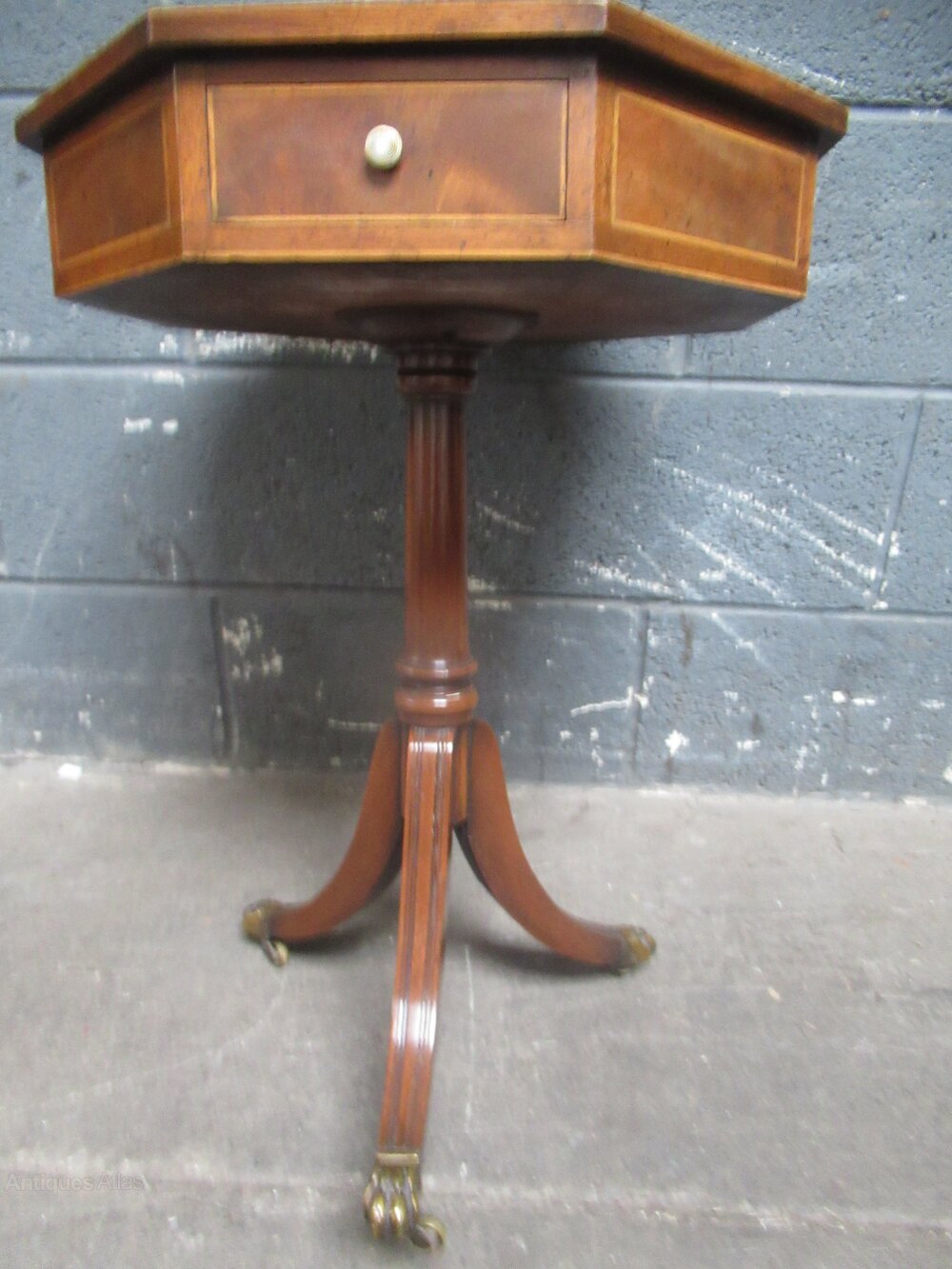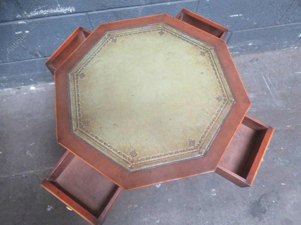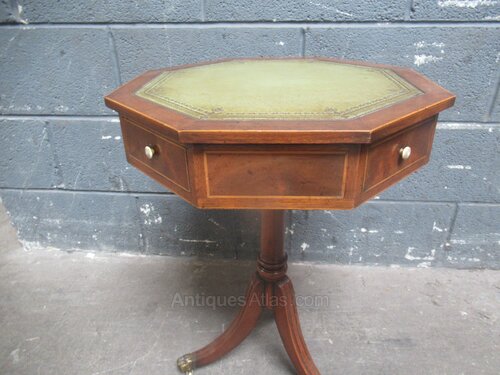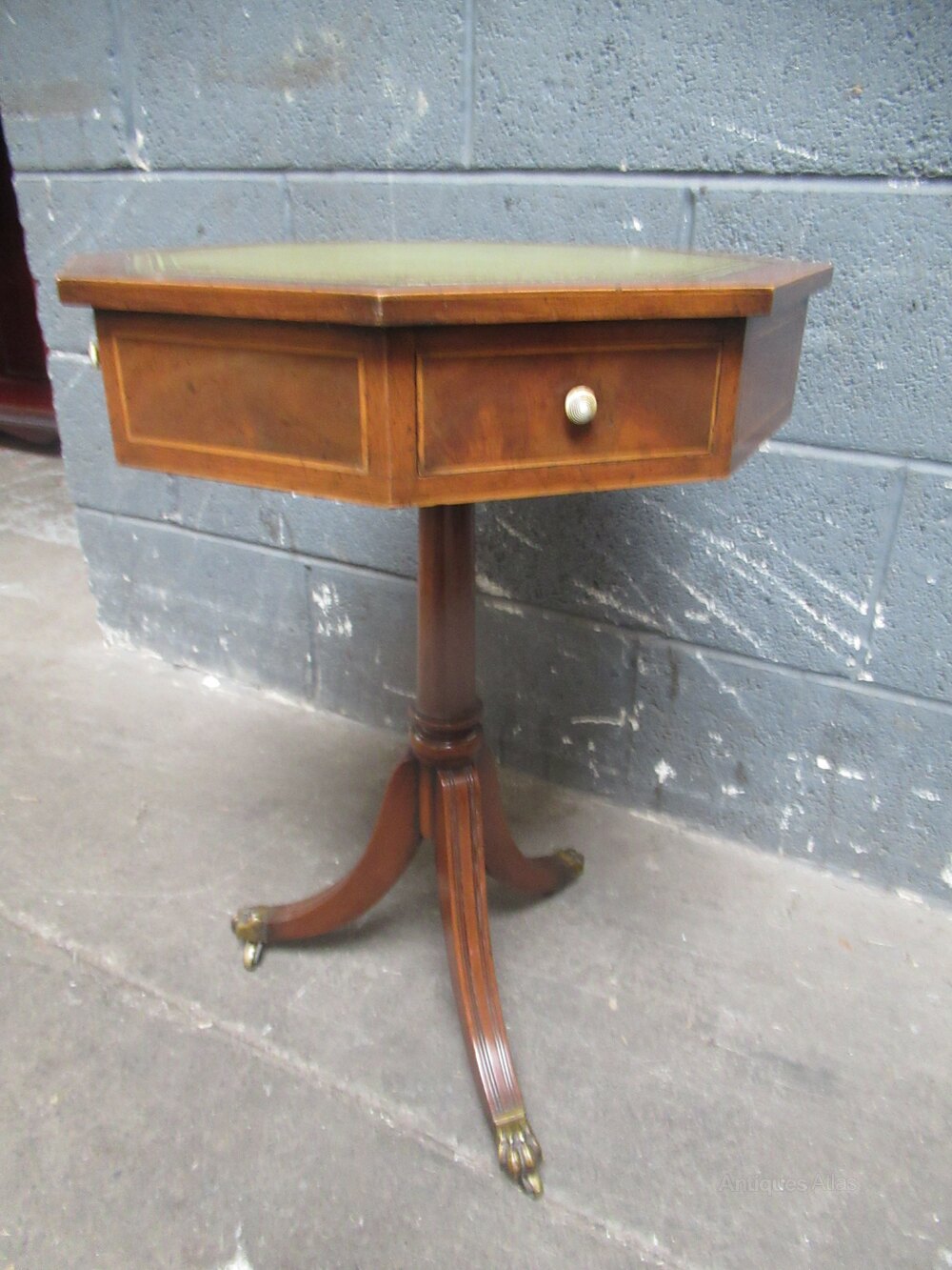 Antique style mahogany hexagon side table , with a pale green leather liner to the top. A turned pedestal to three splay legs with brass lion paw feet . The top has four small drawers with a white knob. line inlay .