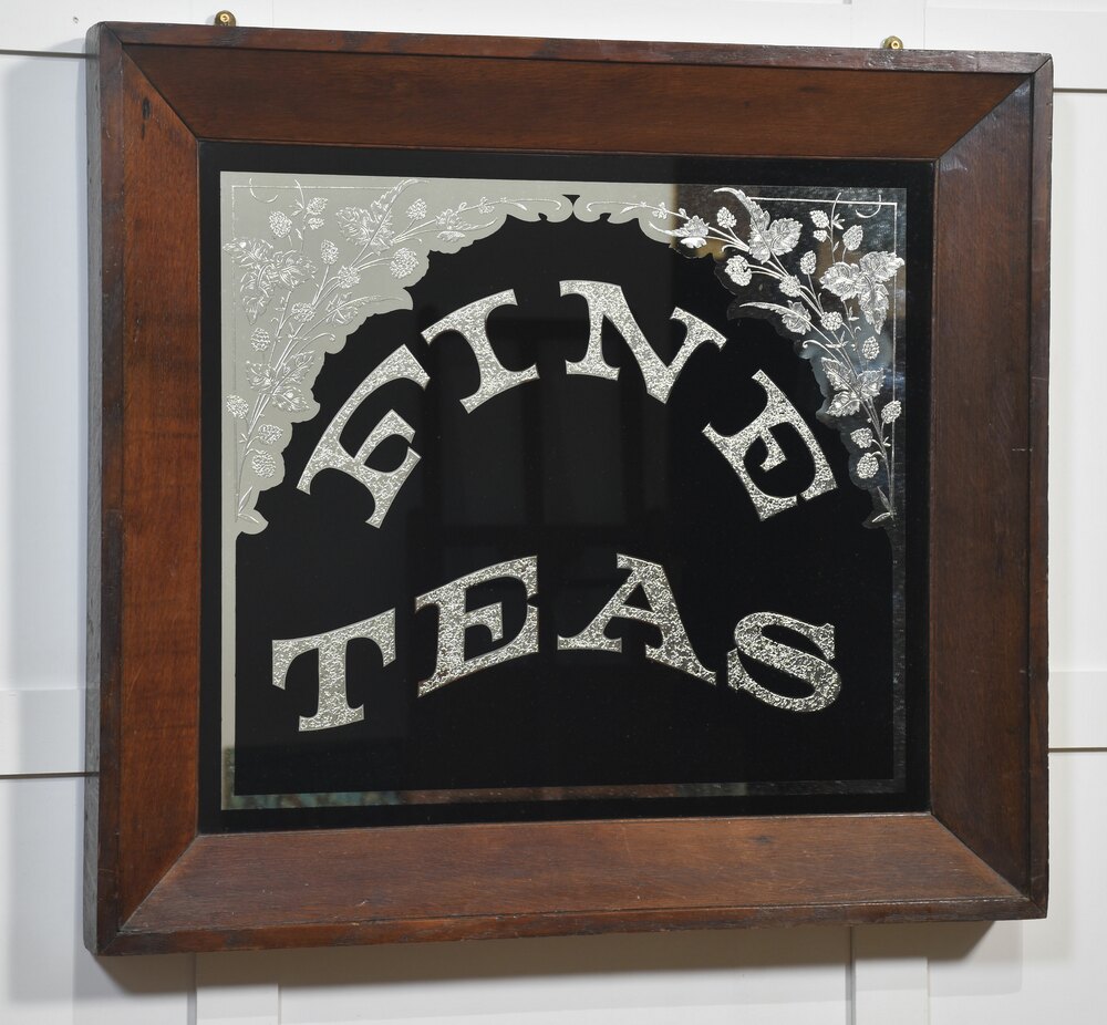 Oak framed advertising mirror encased in oak frame, inscribed Fine Teas on a black background decorated with floral relief.