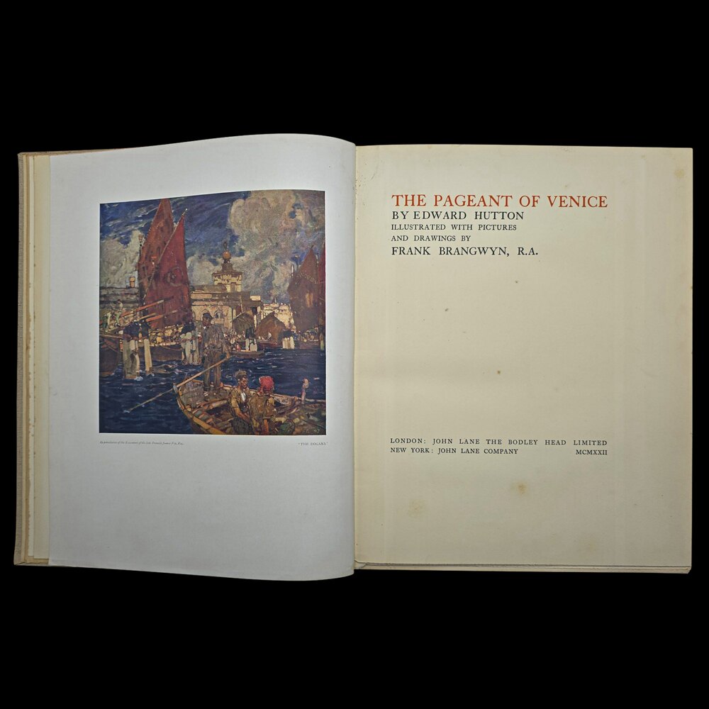 This is an antique copy of The Pageant of Venice, a superb early 20th century art and history book written by Edward Hutton with illustrations by the renowned artist Frank Brangwyn. Dating to circa 1920, this elegant volume presents a richly illustrated exploration of Venice’s history, art, and culture, capturing the spirit of the city through 20 vibrant colour plates and 32 striking red illustrations. In intact, original order with light markings commensurate with age, this is a fine collector’s book and an ideal decorative addition to a study or library.