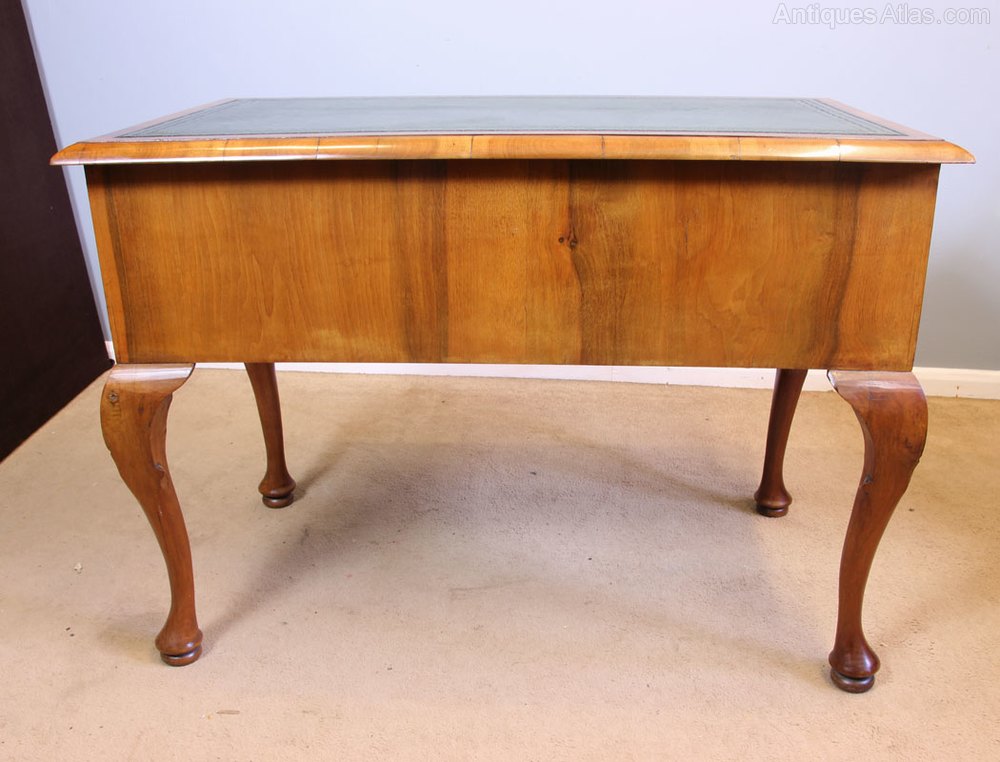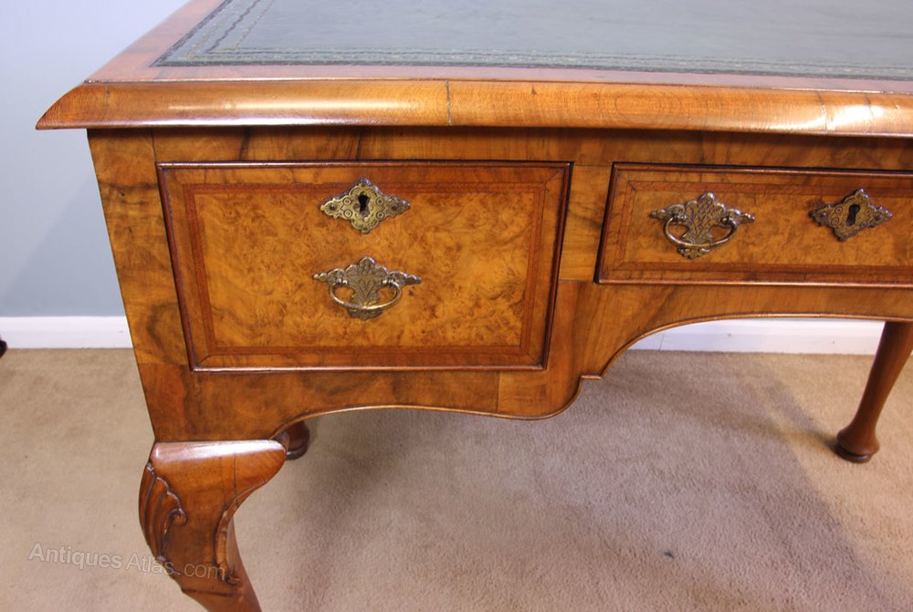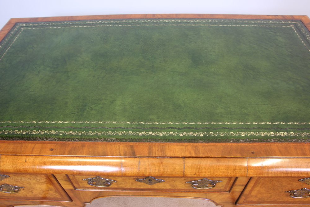 Antique Burr Walnut Leather Top Writing Desk. This wonderful burr walnut writing desk has a leather writing surface with burr walnut moulded edge. Under having centre drawer flanked either side by drawer the drawer fronts are lovely burr walnut with crossbanded edge all supported by cabriole style legs with carved shell detail at the top of the leg. This desk is polished at the back so would be able to stand in the centre of a room.