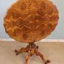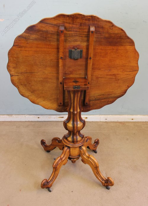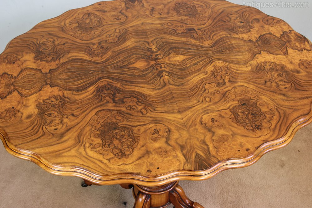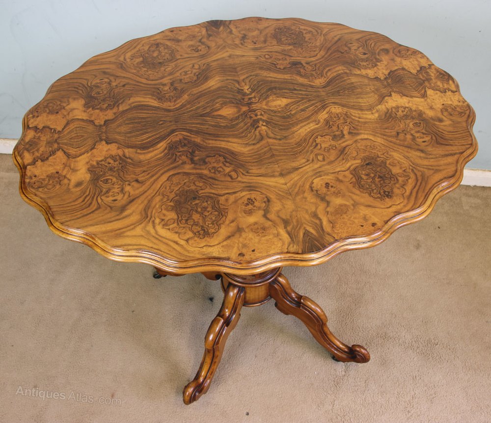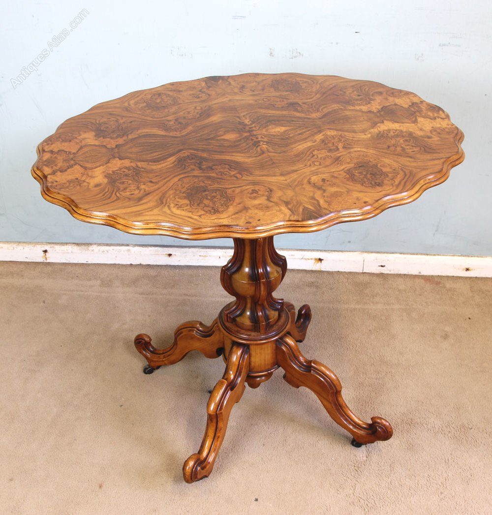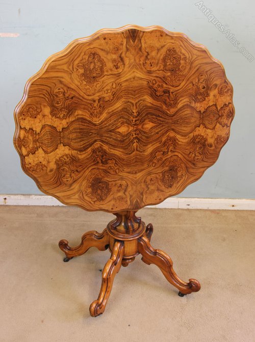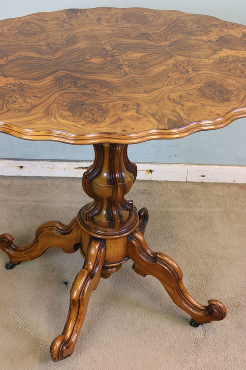 Antique Burr Walnut Shaped Occasional Table. This wonderful burr walnut occasional tilt top / centre table has a wonderful figured walnut top with moulded edge. The table top is all supported by a turned centre column with finial under and four scroll shaped legs with castors under.