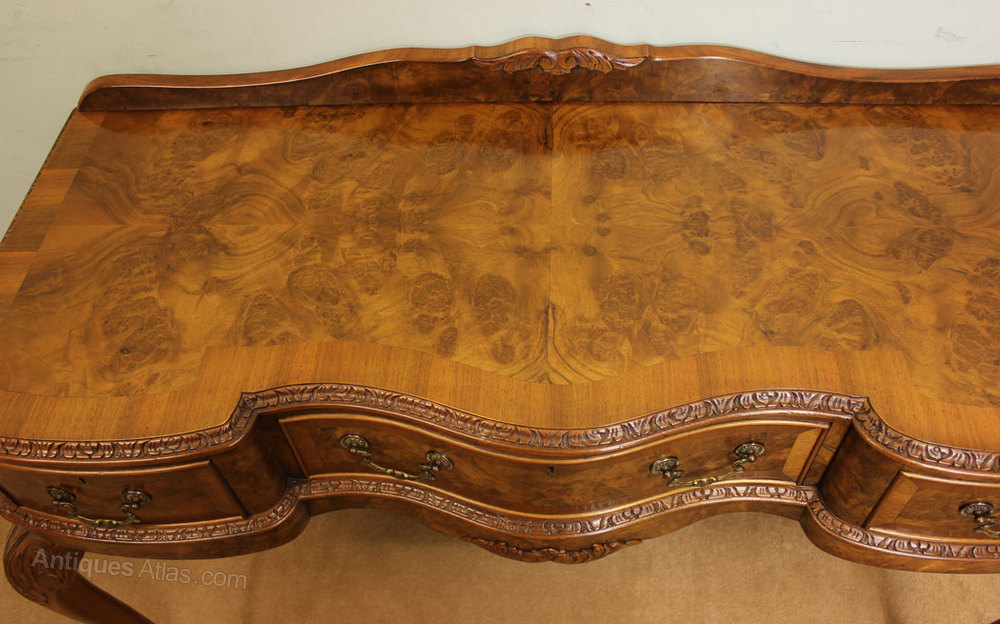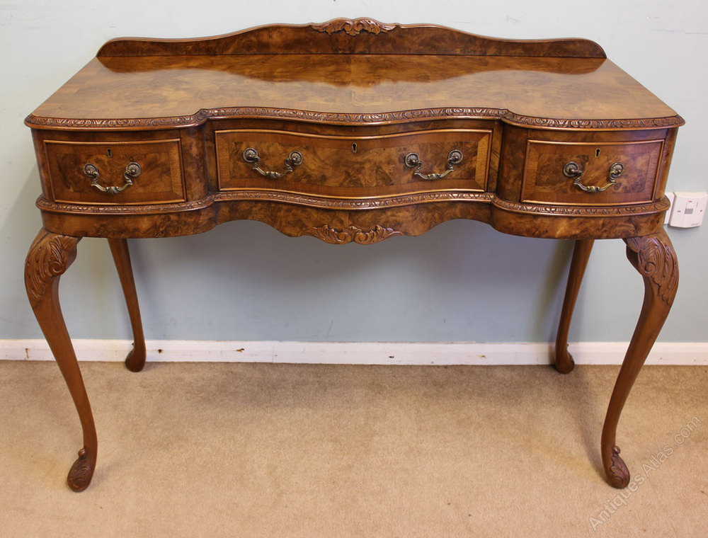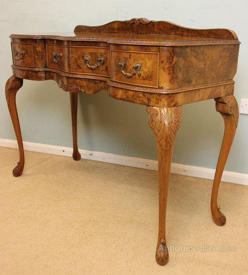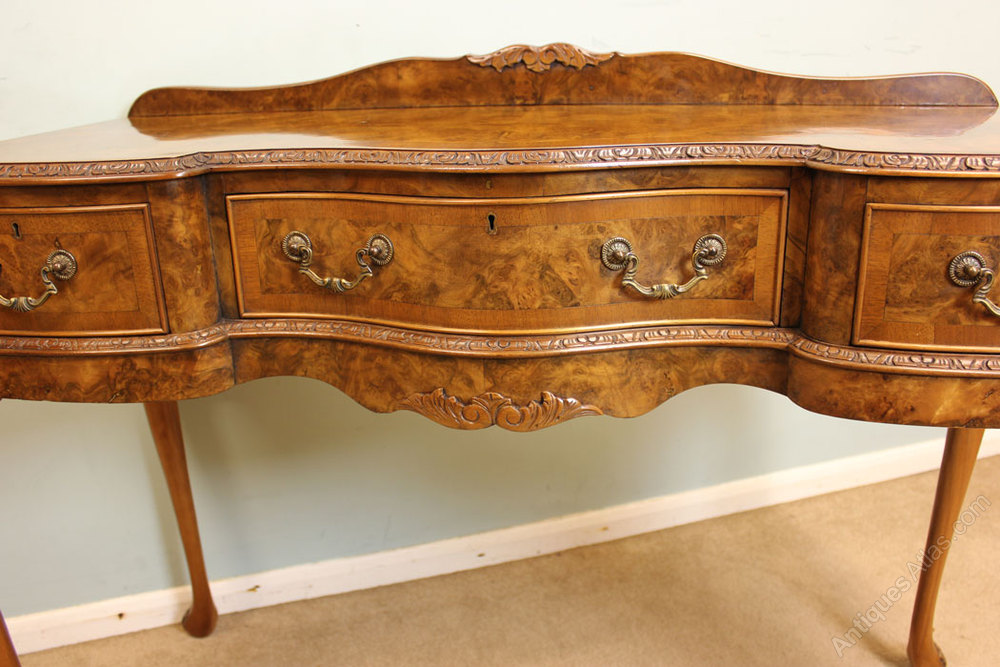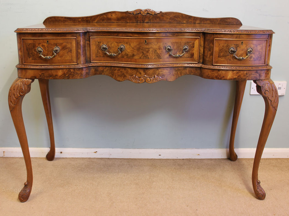 Antique Walnut Serving Table, This antique Queen Anne style burr walnut side / serving table has a lovely burr walnut and cross banded shaped top with carved edge and a up stand to the back, There are three drawers under fitted with brass handles these are divided and lined out for cutlery, The whole piece is supported by cabriole scroll shaped legs with carved decoration. Circa 1920
