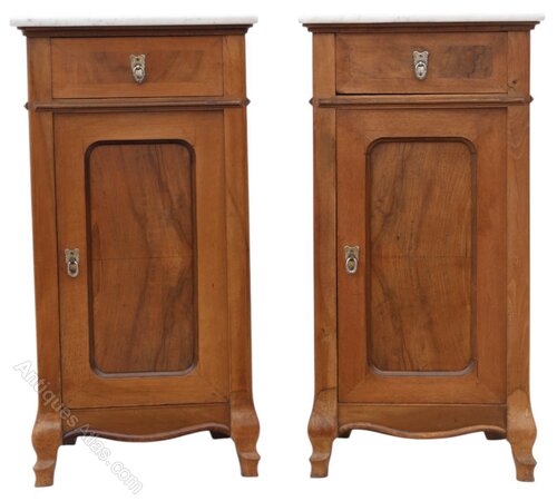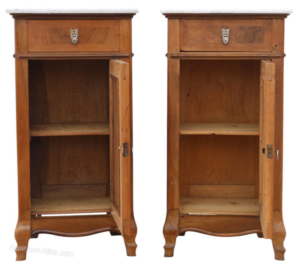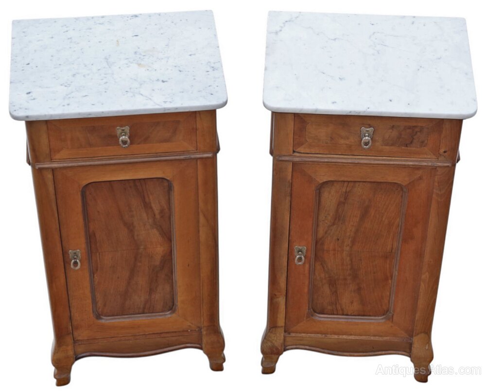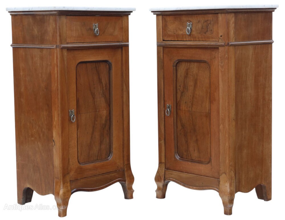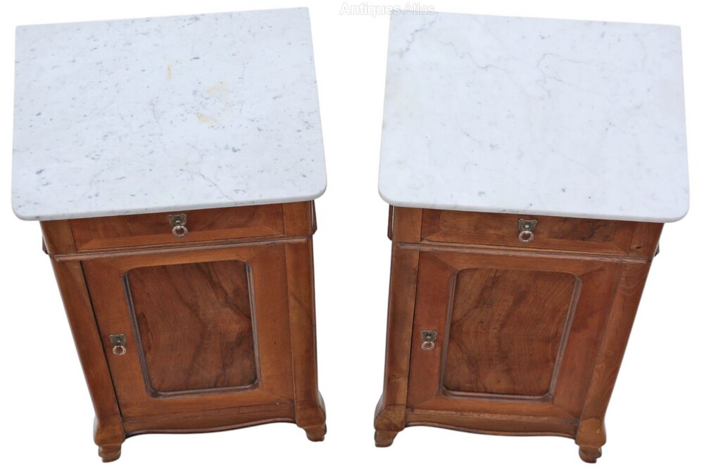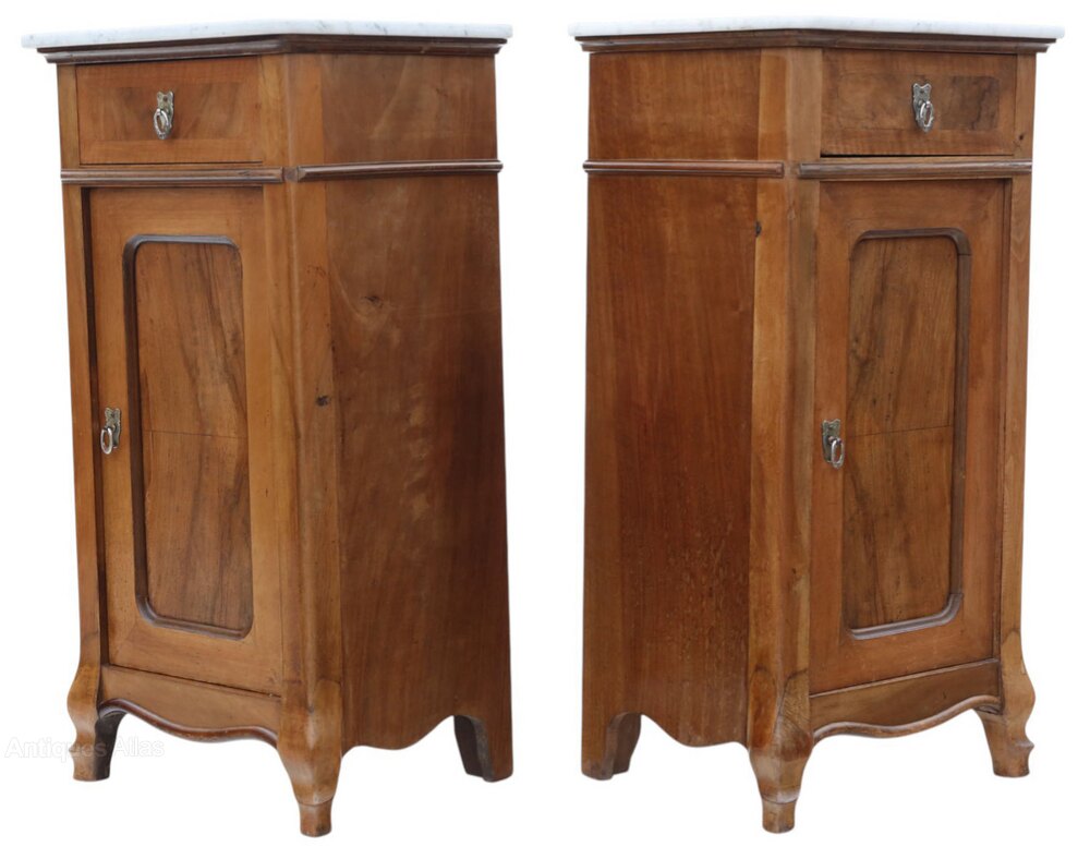 Antique c.1910 Pair of Cherry & Walnut Bedside Tables with Marble Tops – Fine Quality Nightstands