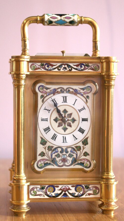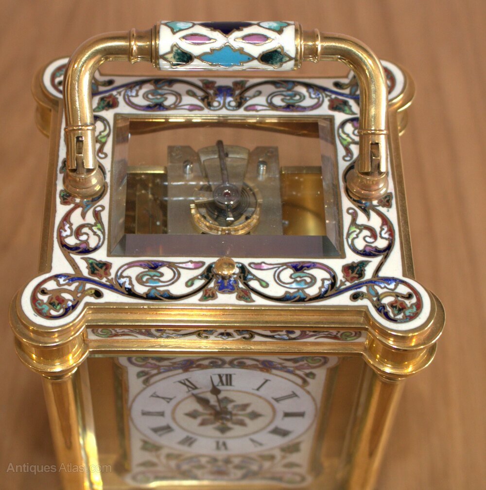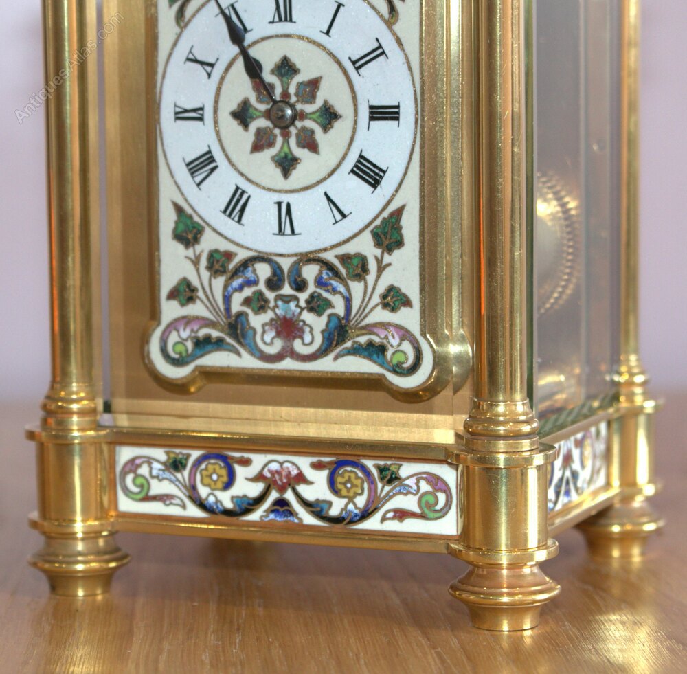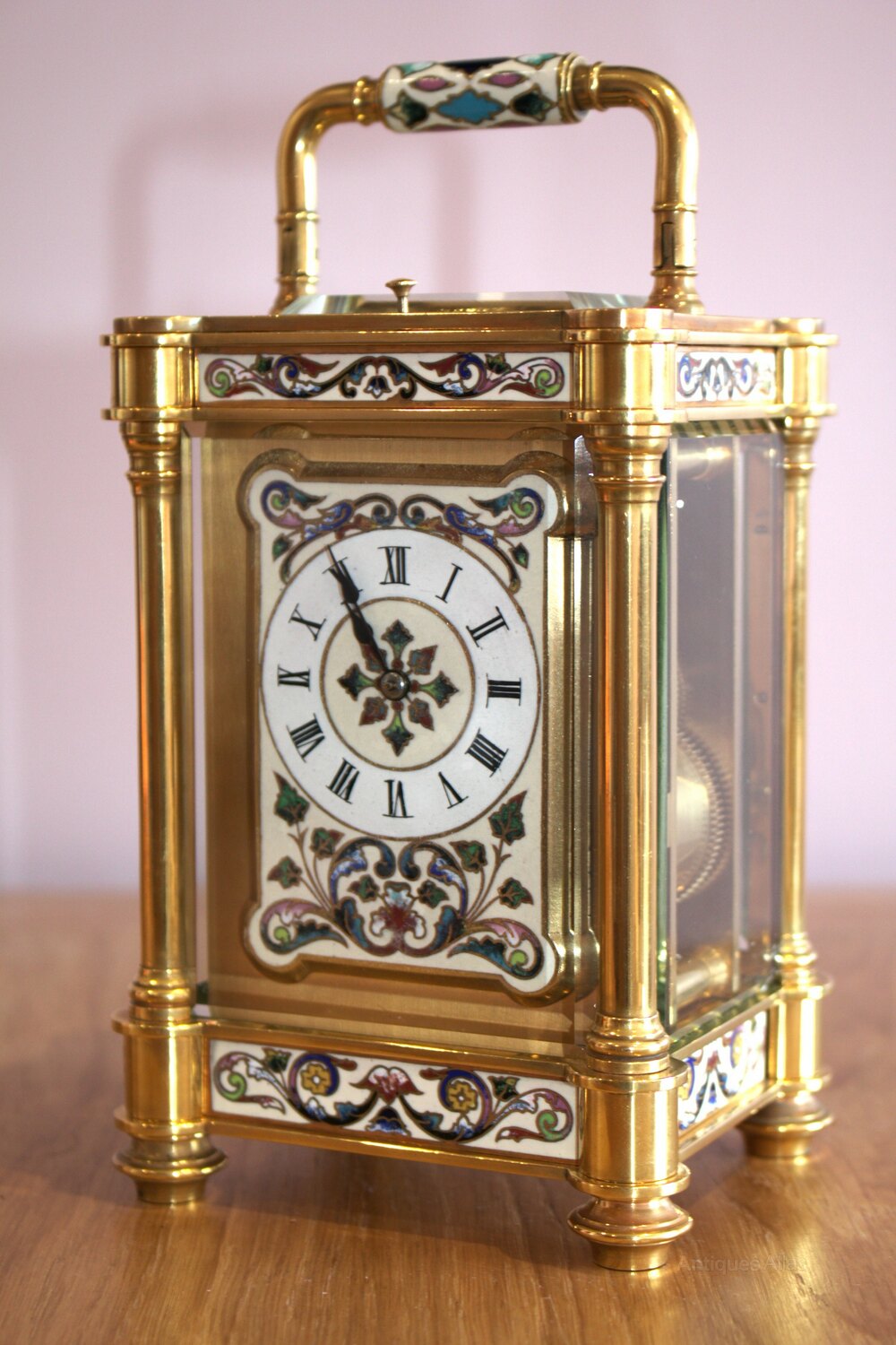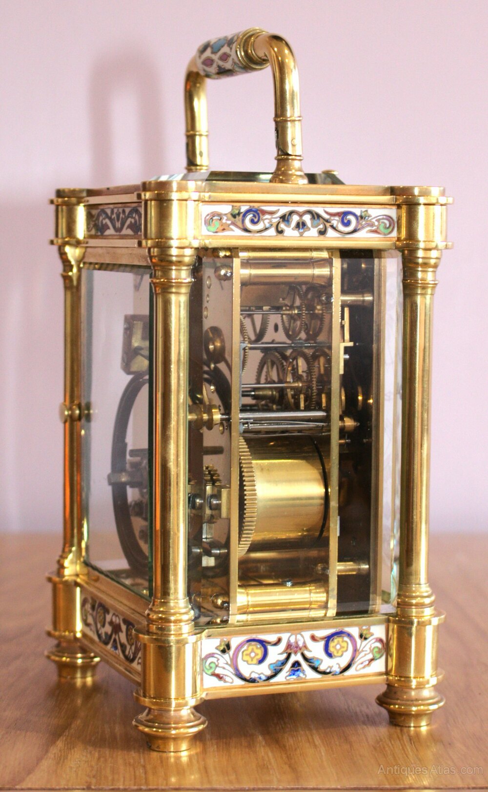 This Antique Champleve Large Repeater Carriage Clock is an antique piece from France, all handmade crafted from brass with champleve enamel finish . The rectangular shape and analogue display give it a classic and timeless appeal. This original carriage clock exudes antique charm and is a stylish addition to any room. With its intricate design and mechanical movement, this clock is sure to be a conversation starter in any home. A rare and highly individual French carriage clock the eight-day duration movement has a platform lever escapement and strikes the hours and half-hours on a gong, with a repeat button set to the top to sound the last hour at will.