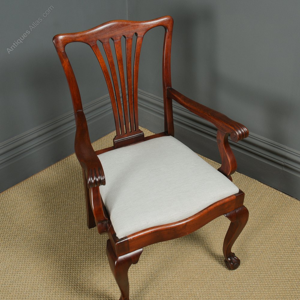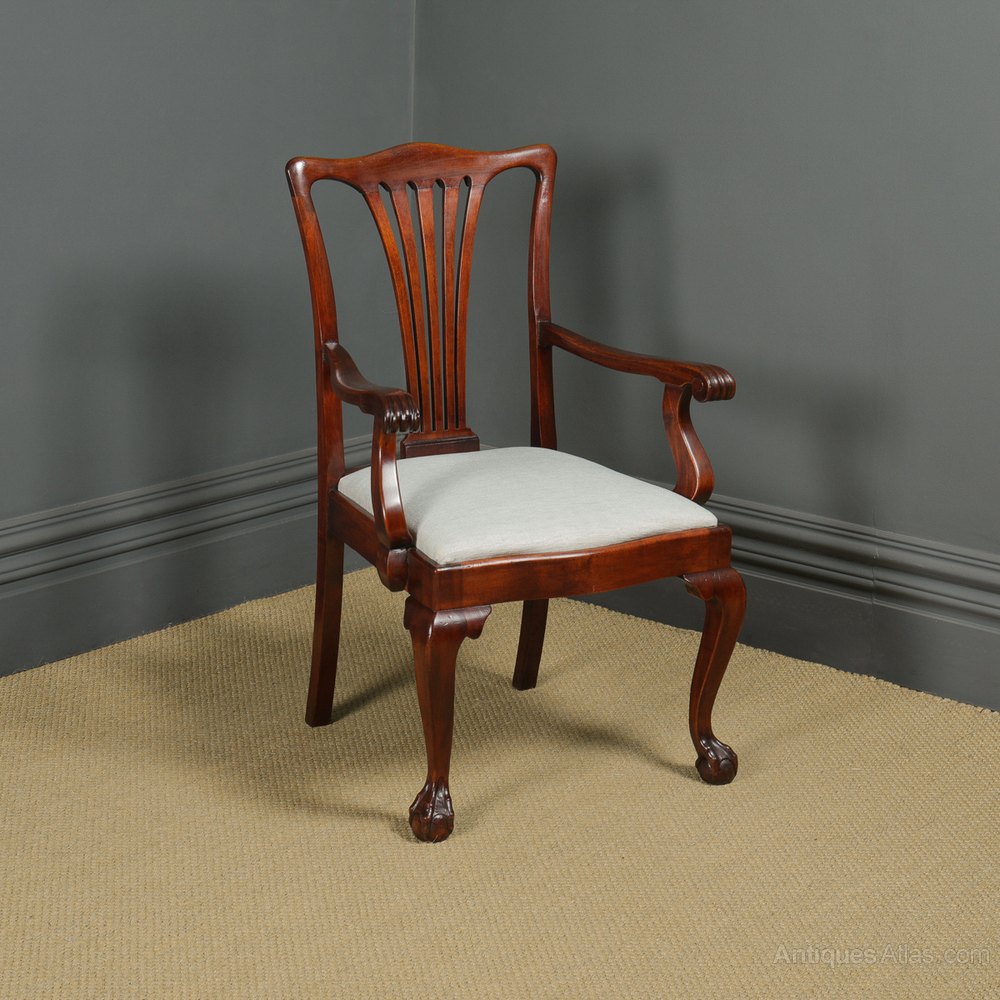This is a fine quality antique English Chippendale style armchair, constructed of solid mahogany, during the Victorian period, circa 1870, with a newly upholstered seat, in excellent original condition. This is a large sturdy chair, with generous proportions. The chair is constructed from solid mahogany and is designed with a shaped top rail and pierced fan back. Elegant splayed arms, incorporating elegant scroll carved ends, unite the back and seat frame, which are raised on shaped supports. The Chippendale style armchair drop-in seat has been newly upholstered to a professional standard in a pale duck egg blue structured cotton upholstery, finished with traditional webbing and hessian to the underside. The seat is firm but extremely comfortable to sit on. The Chippendale arm chair stands on cabriole legs at the front, terminating on well carved ball and claw feet, with sabre legs to the rear.