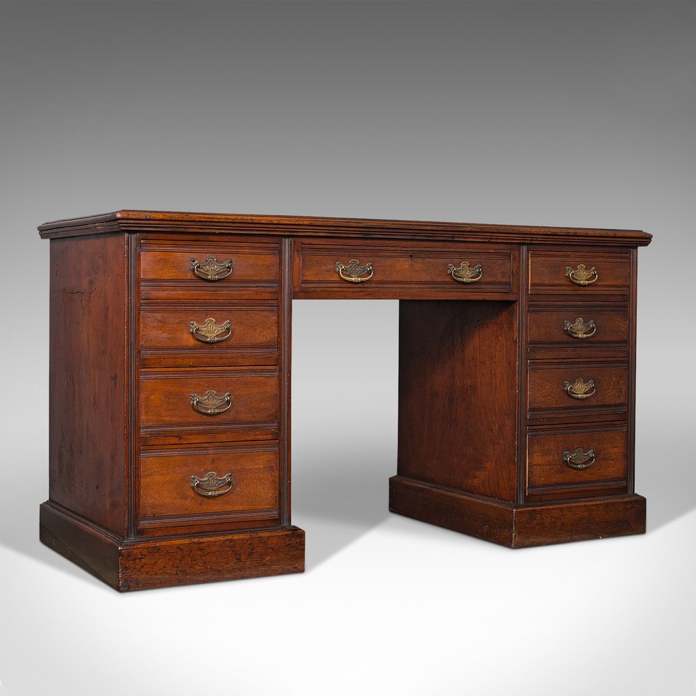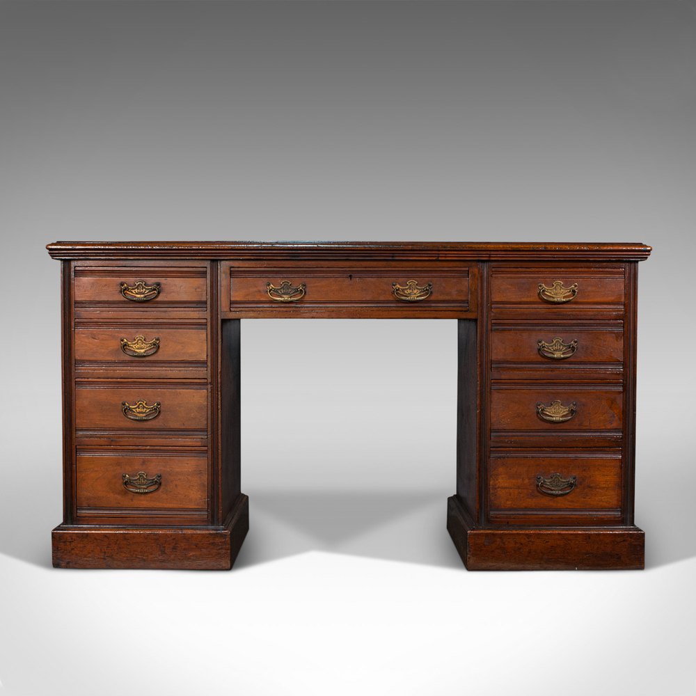 This is an antique clerk's desk. An English, walnut pedestal writing table, dating to the Victorian period, circa 1880.