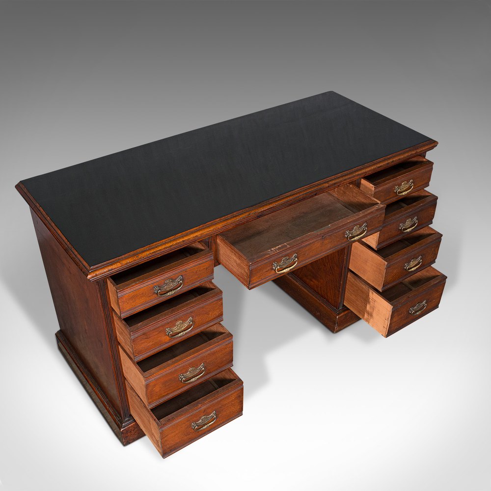 Antique Pedestal Desk, English, Oak, Leather
