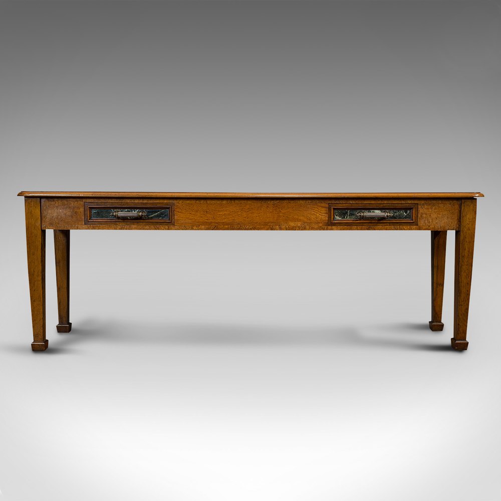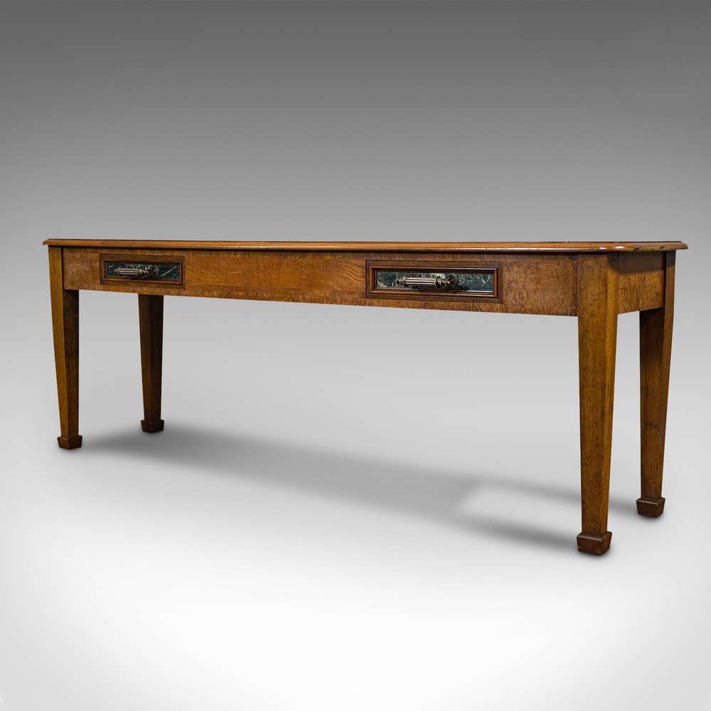 This is a delightful antique console table, with impressive proportion and a level of craftsmanship that will appeal to many. Offering super grain interest, warm, rich colouration and luxury appointments such as Belgian marble, this table will grace the study, hallway or any room. Solid joints and construction, delivered waxed, polished and ready for the home.