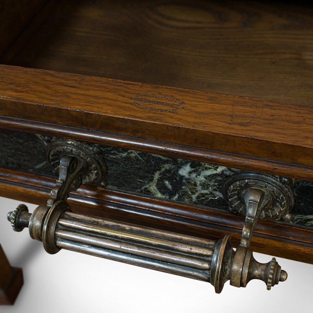 This is an antique console table. A large, Scottish walnut and oak desk or hall table by J & T Scott of Edinburgh, dating to the Victorian period, circa 1880.