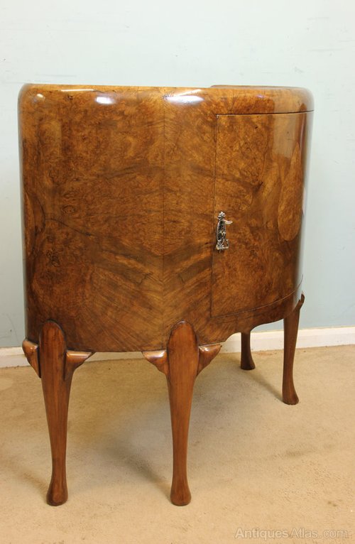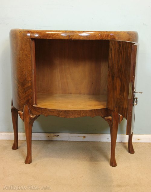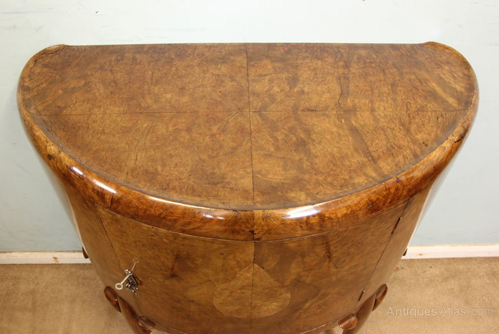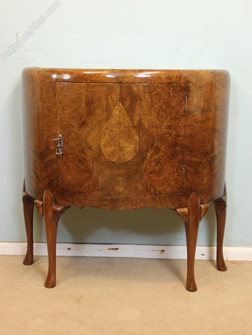 Antique Demi Lune Burr Walnut small Sideboard / Side Cabinet. This lovely burr walnut demi lune side cabinet / cupboard has lovely figured walnut quarter veneer dished shaped top under having cupboard door with decorative handle and back plate the whole piece is all of lovely shape and is all in lovely figured walnut having shaped apron under and all supported by Queen Anne style legs.