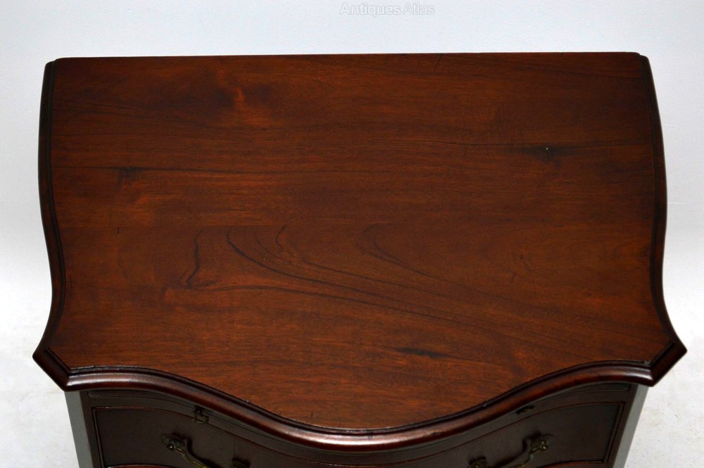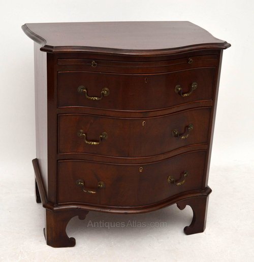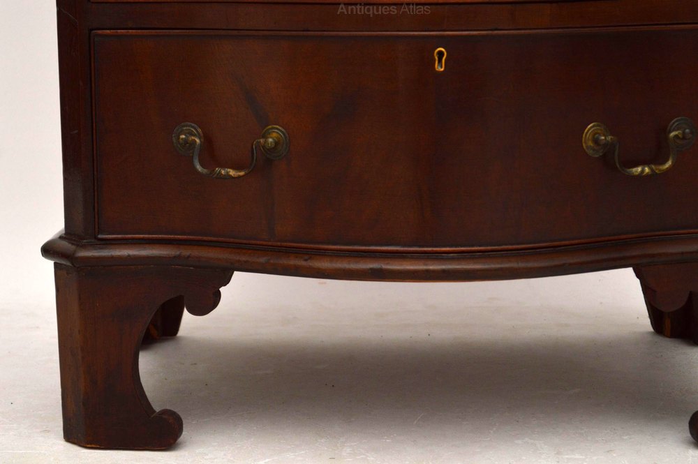 This fabulous smallish gutsy antique mahogany chest of drawers has all the qualities & looks of a period Georgian piece, but it dates to around the 1890-10 period. Even so, it's still a fine rare piece & just as good an investment as a period one. It has a generous serpentine front, canted corners, original brass handles & locks on the graduated drawers that also have fine dovetails & solid oak drawer bottoms. This chest sits on bold shaped bracket feet & there is a brushing slide just under the top. It's wonderful quality all over, in good original condition & is very heavy for the size.