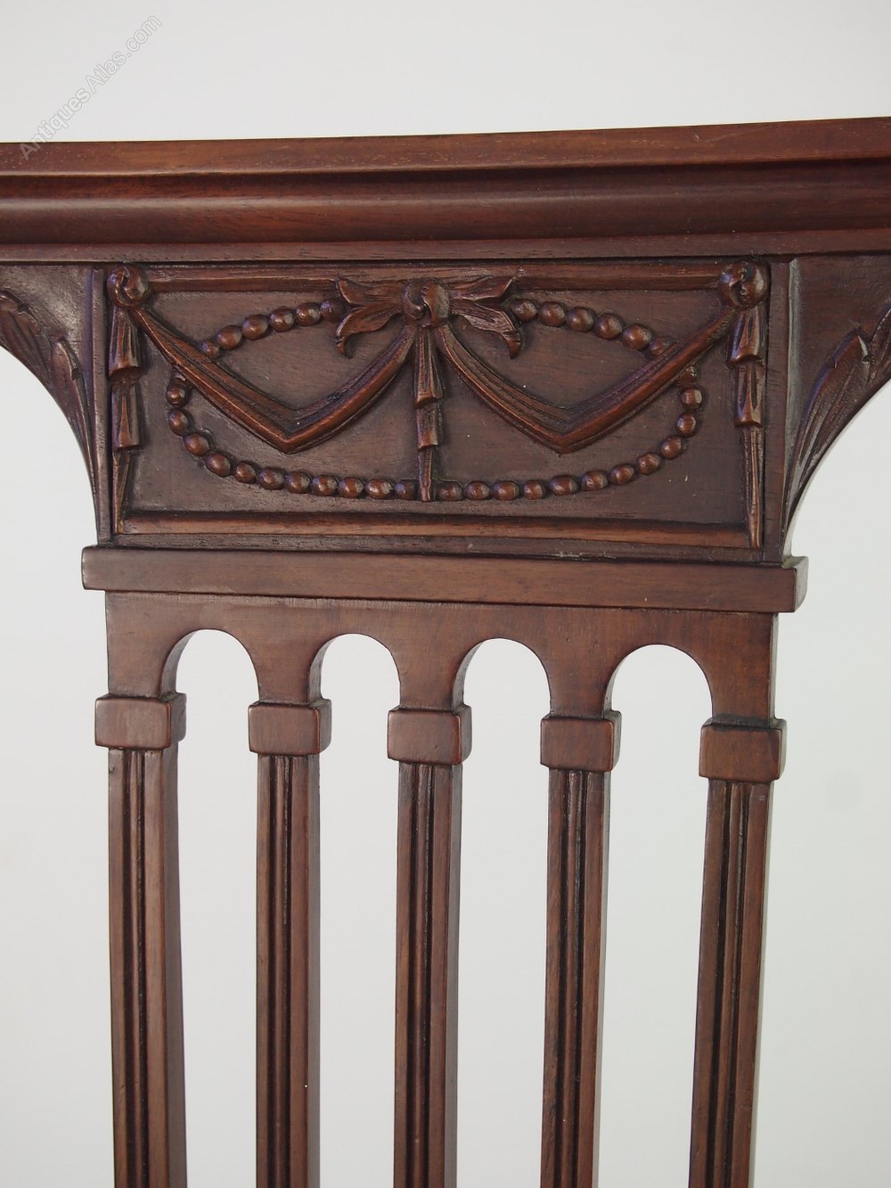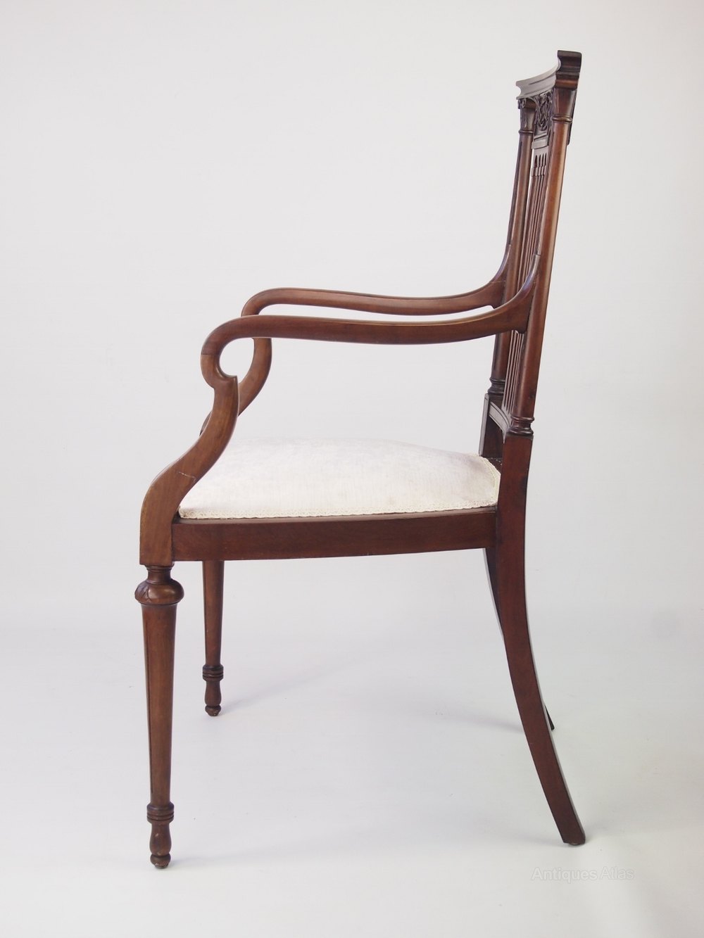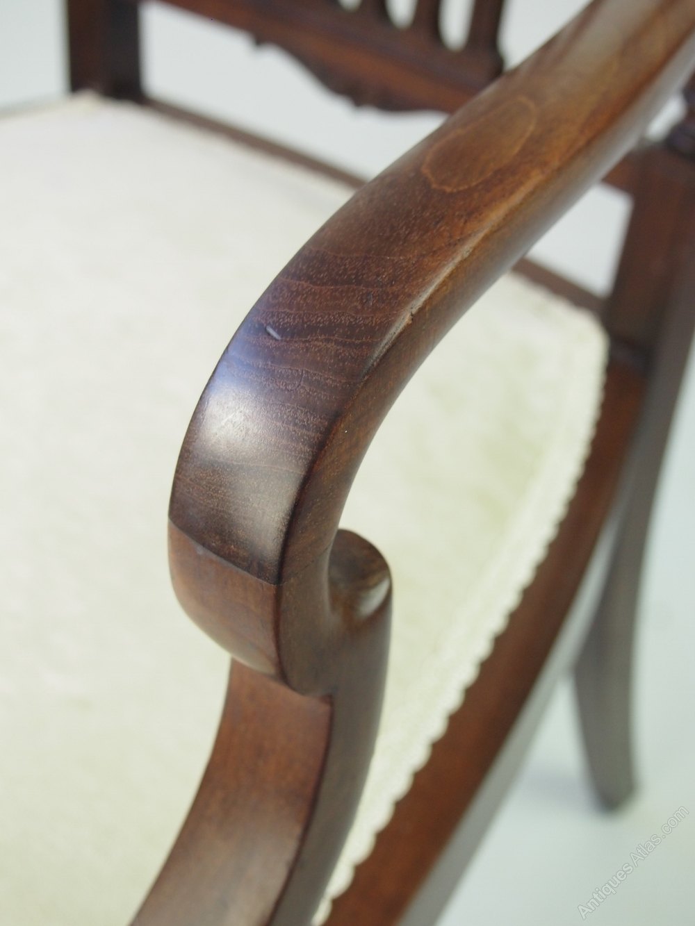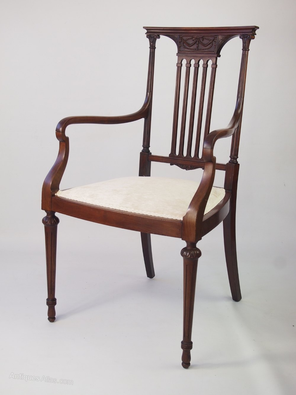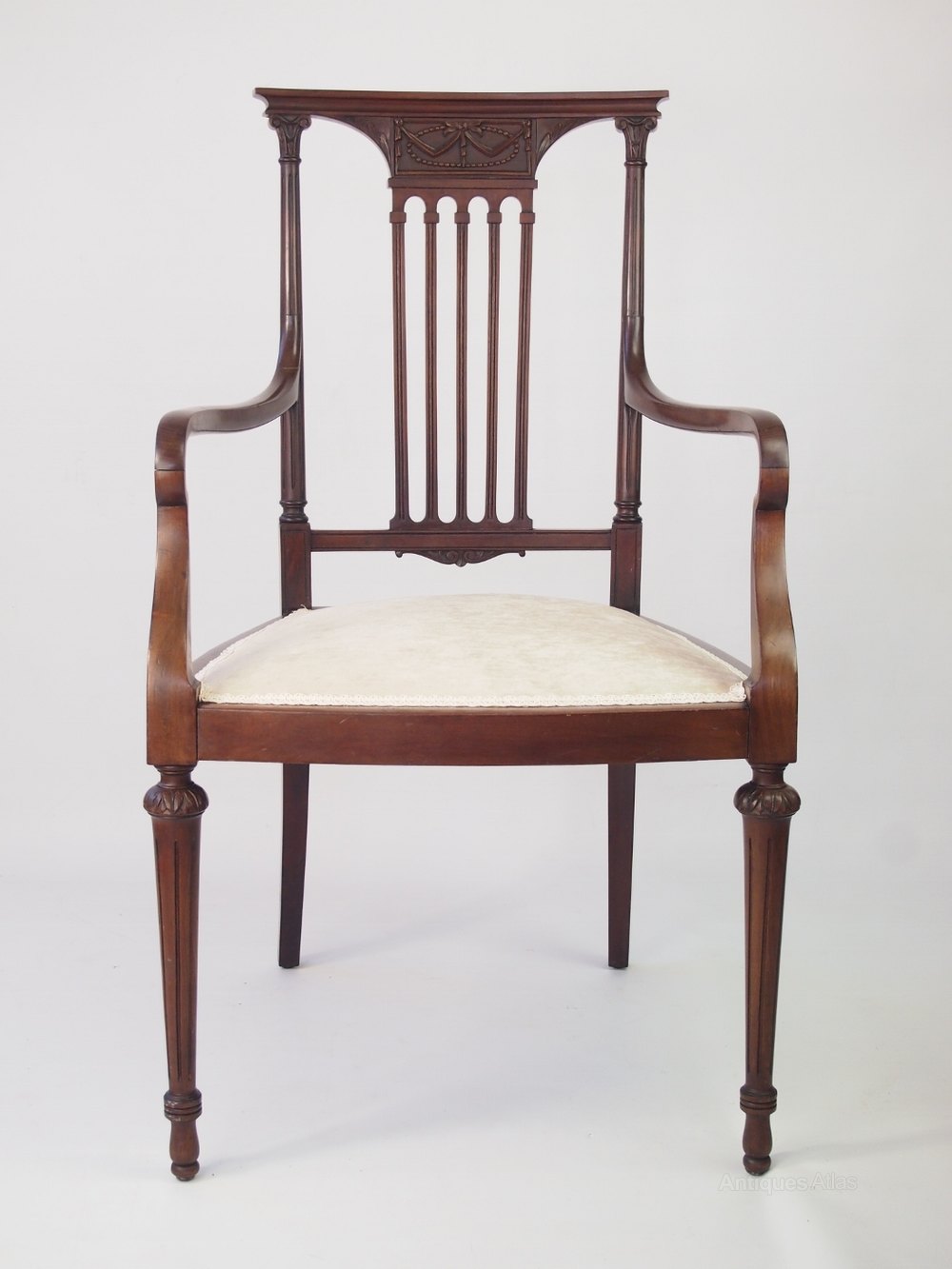 A handsome antique Edwardian open armchair / desk chair in mahogany with a carved back splat, with a neo-classical design of swags and bows. It has 5 slender central splats with reeded side rails in corinthian columnar form. With elegantly curved arms, it stands on slim carved and reeded legs. The chair is in a lovely figured mahogany with a deep rich brown patina. It has been newly re-upholstered in a cream velour fabric.