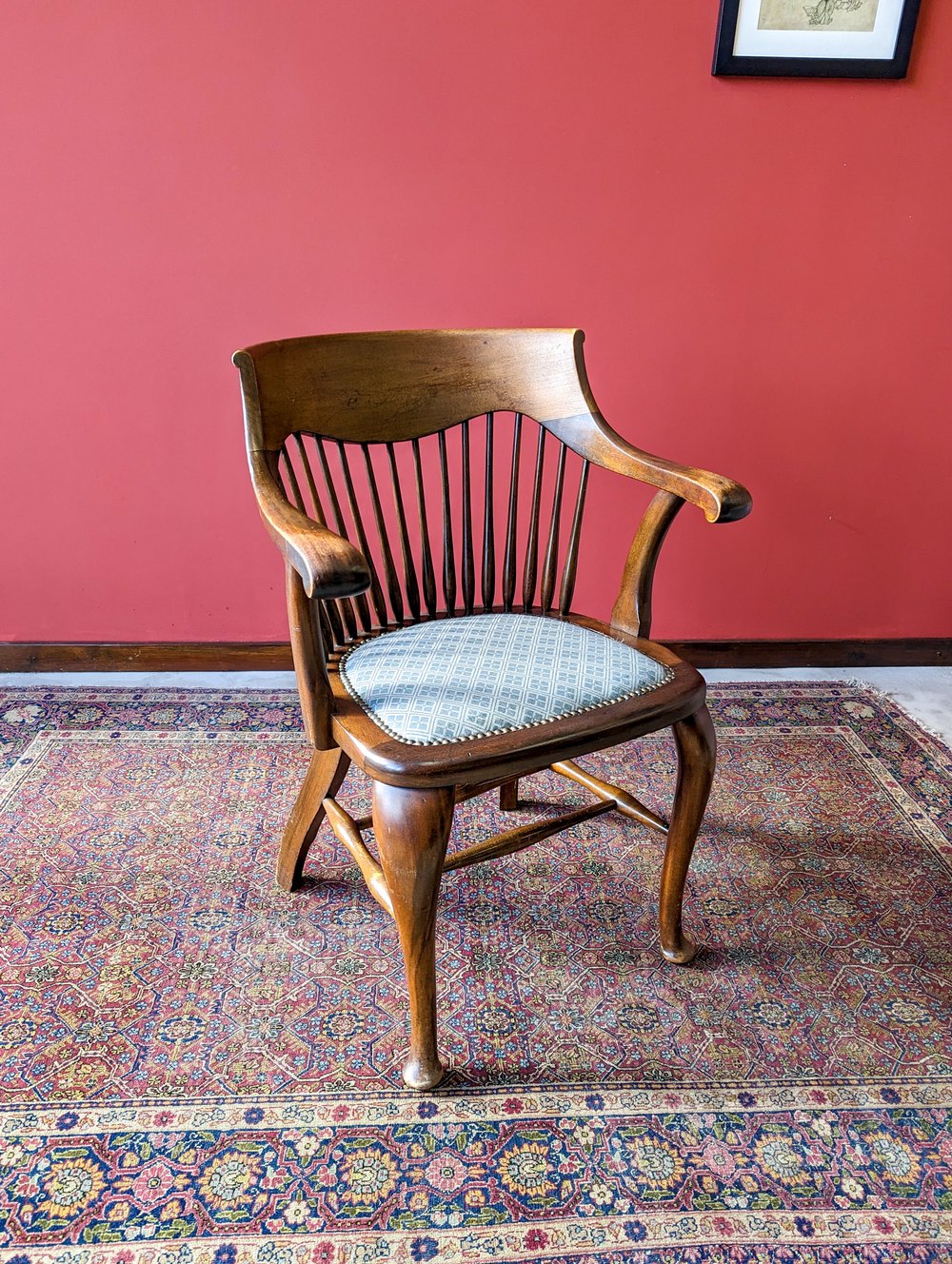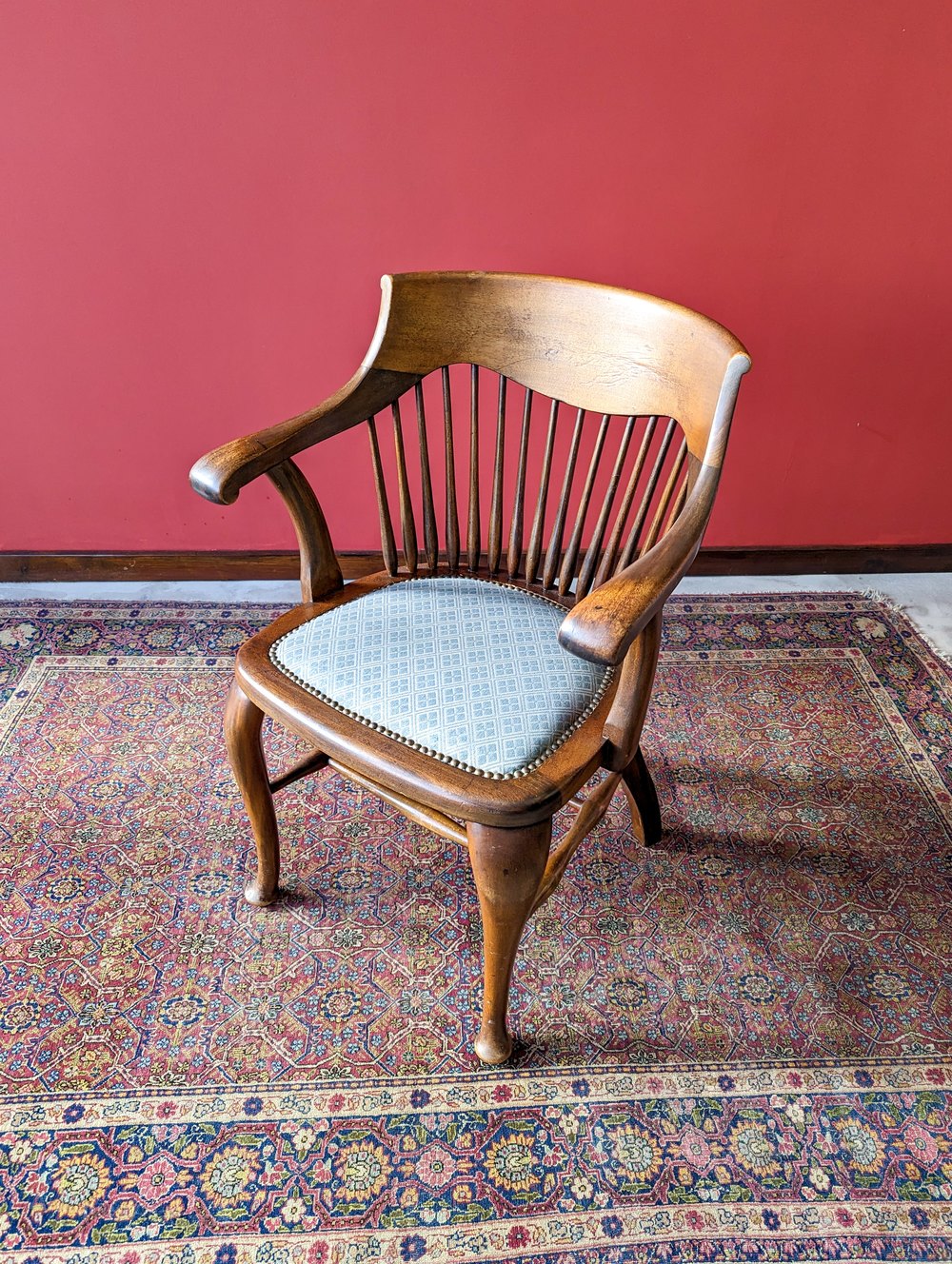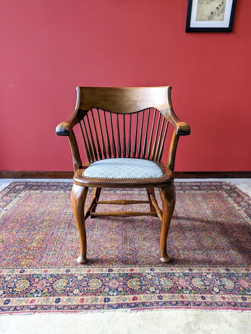A beautifully shaped Edwardian mahogany office chair with a wonderfully contoured backrest supported by an array of spindles with an upholstered seat pad and raised on cabriole front legs united by a double H stretcher.