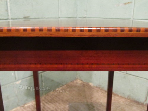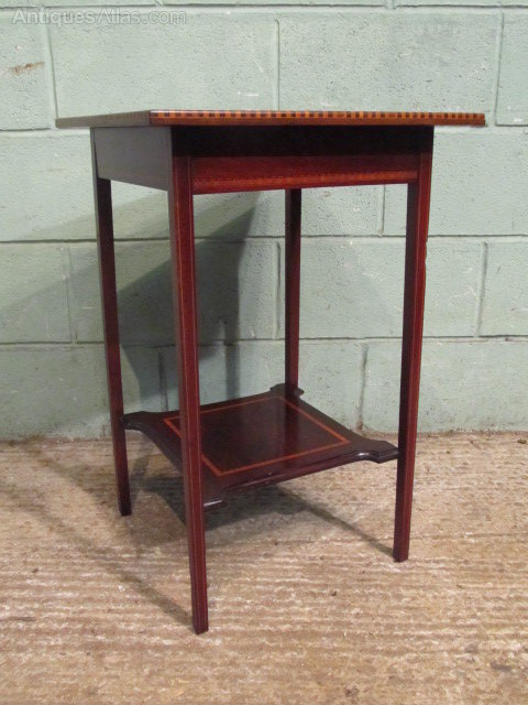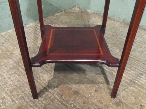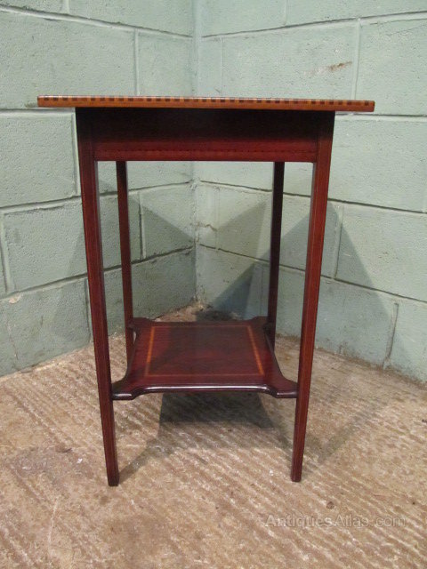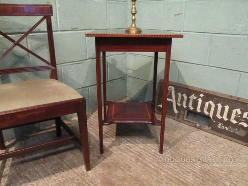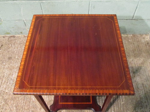 Antique Edwardian Occasional Table and dating from around 1900. Constructed from quality mahogany it has a square solid top with a cross banded and strung edge with dental inlay to the front edge above a deep frieze with inlaid stringing. It stands on squared tapering legs which also have fine satinwood stringing and are joined by an inlaid shaped lower shelf.