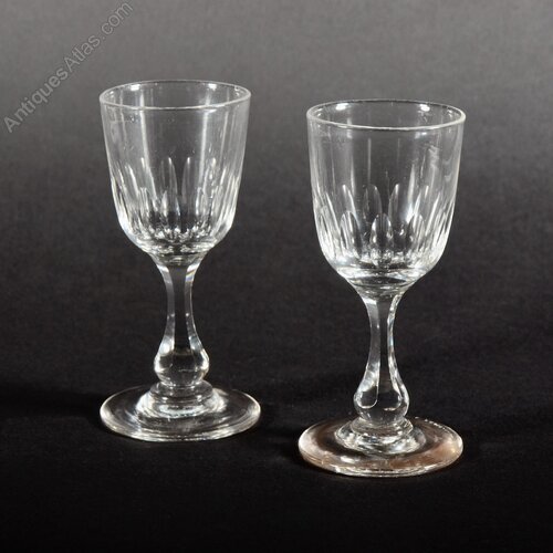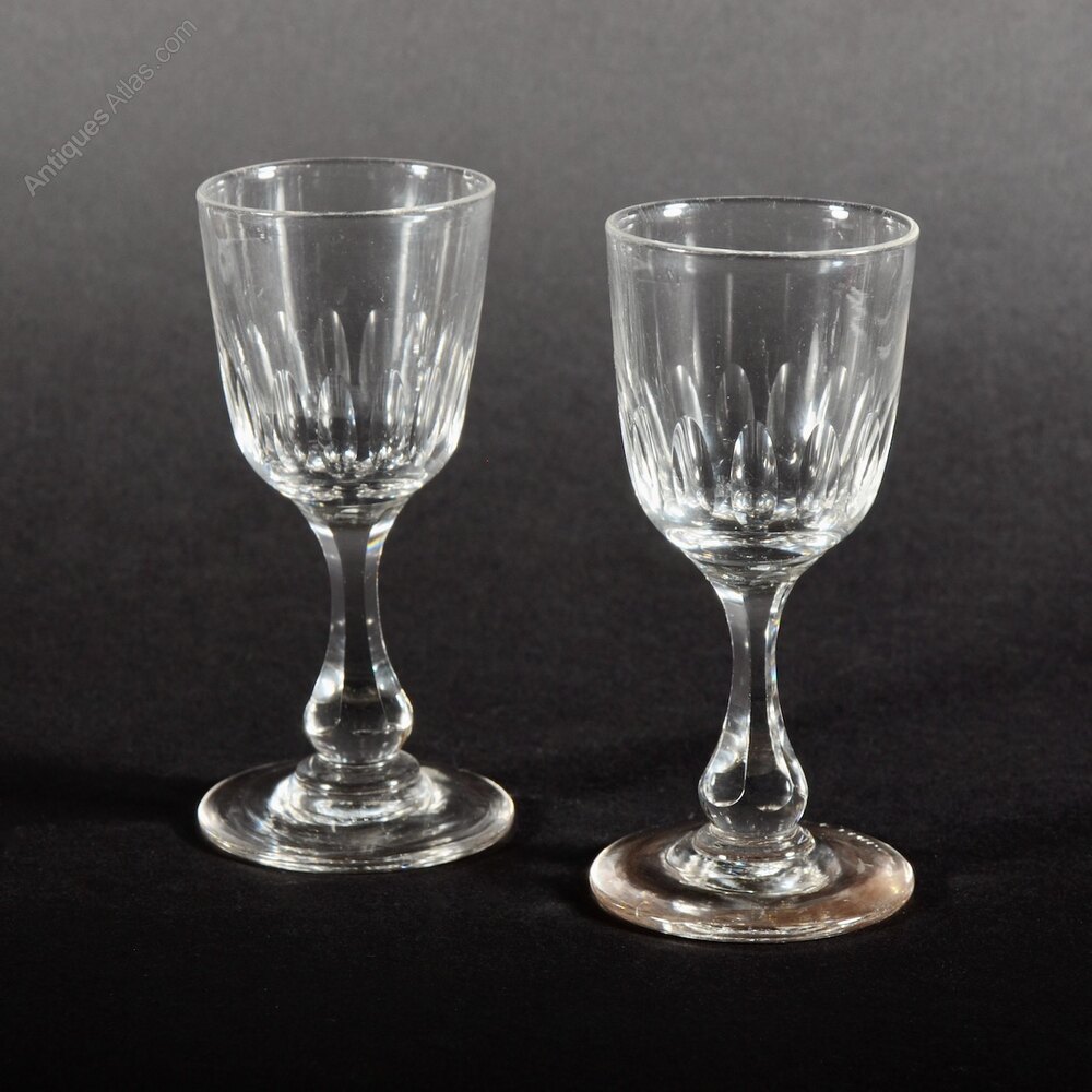 Antique Edwardian pair of engraved wine glasses with polished pontil mark to base, the glass bowl rests on affected stem and plain foot. Excellent Condition. H. 12.5cm. Dia 5cm. Rim. Dia 5.75cm. Base.
