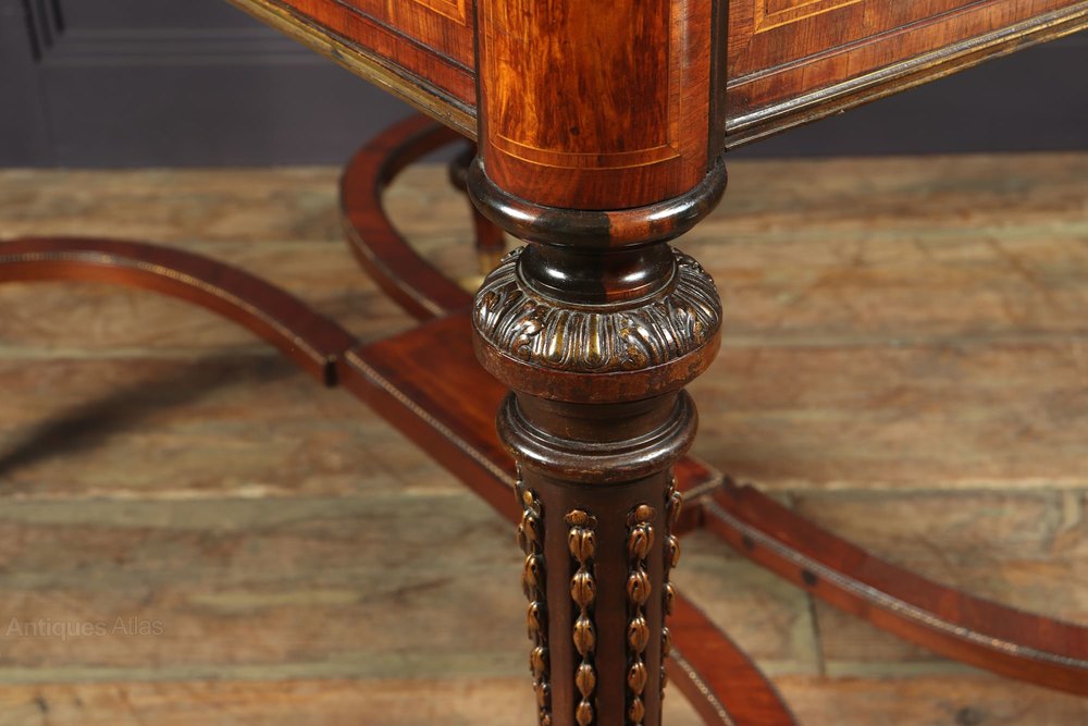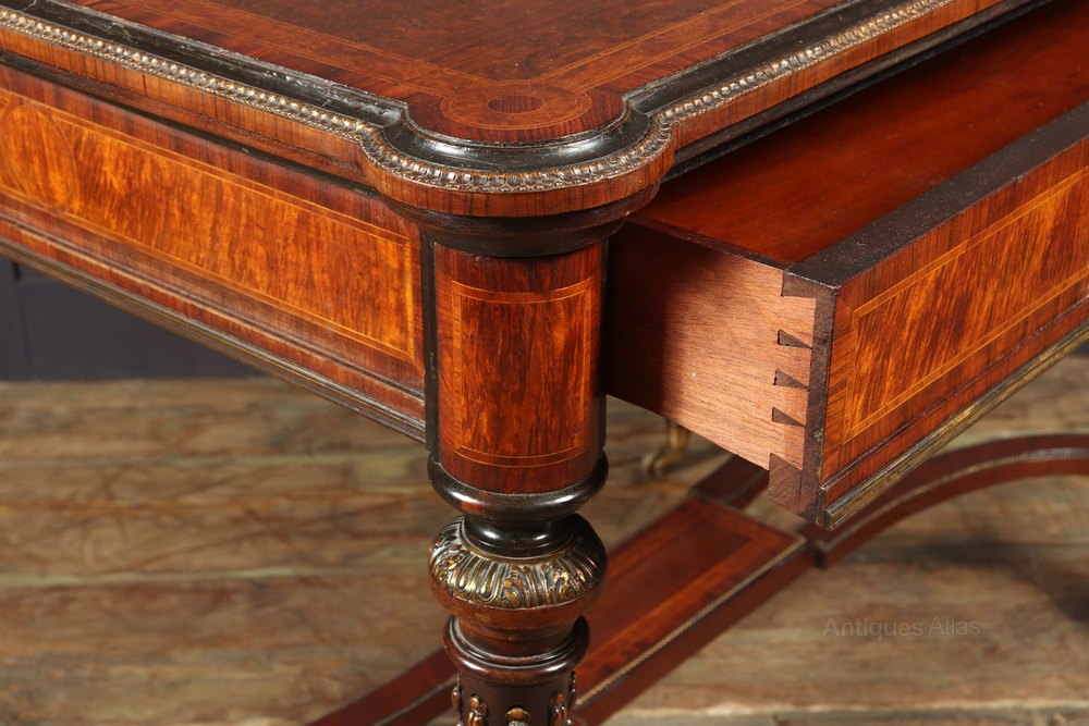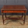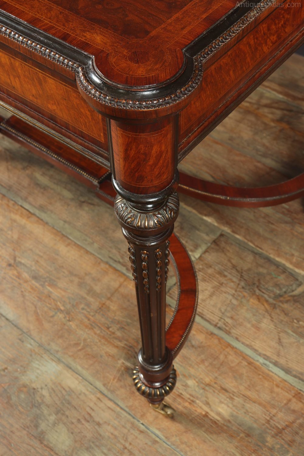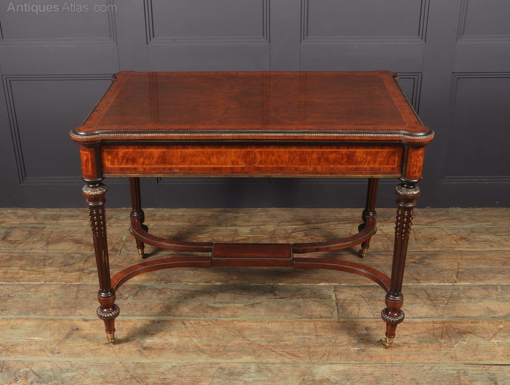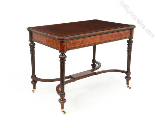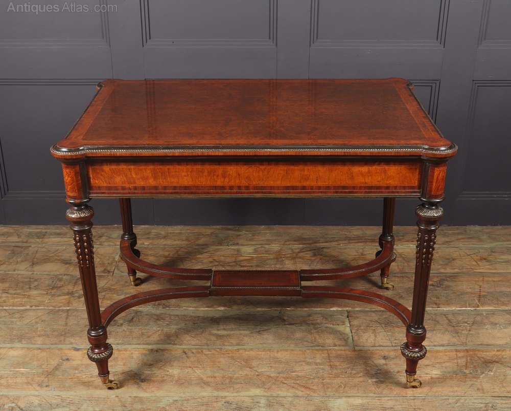 A lovely Antique burr walnut writing table produced in England around 1880 in the manner of Louis XVI antique furniture, great quality inlay and brass mounts, single drawer with hand cut dovetail joints turned and reeded leg and finished with castors, great condition throughout