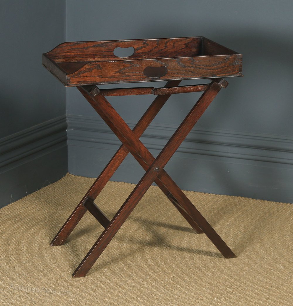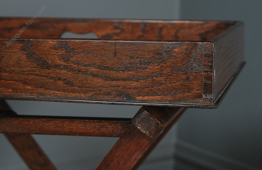 Condition This is a good quality antique late Victorian oak butlers’ tray on stand, with good colour, circa 1900, in excellent original condition. There are nominal old use marks to the leading edges and top but nothing significant considering the age of the item and years of use. The oak Butlers’ tray has been wax-polished by hand to a professional standard in our workshop. There are no ring / water marks on the tray top surface. The hinged oak bars to the stand are original and in good working condition. There are no splits to the top either. The wooden tray and stand are both sturdy. This oak butlers’ tray is solid in joint and ready to use.