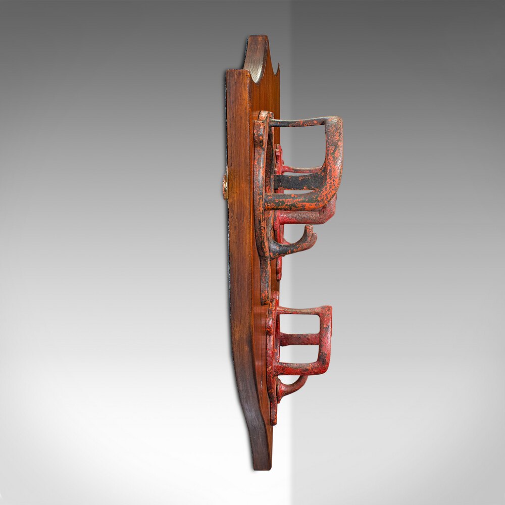 This is an antique equestrian yard master’s hanging shield. A Scottish, pitch pine and cast iron tack mounting plaque, dating to the late Victorian period, circa 1900. A charmingly practical piece, perfectly suited to a stable block, tack room or country-house equestrian setting.