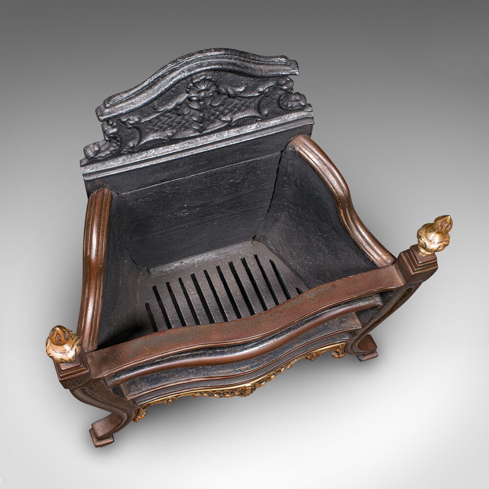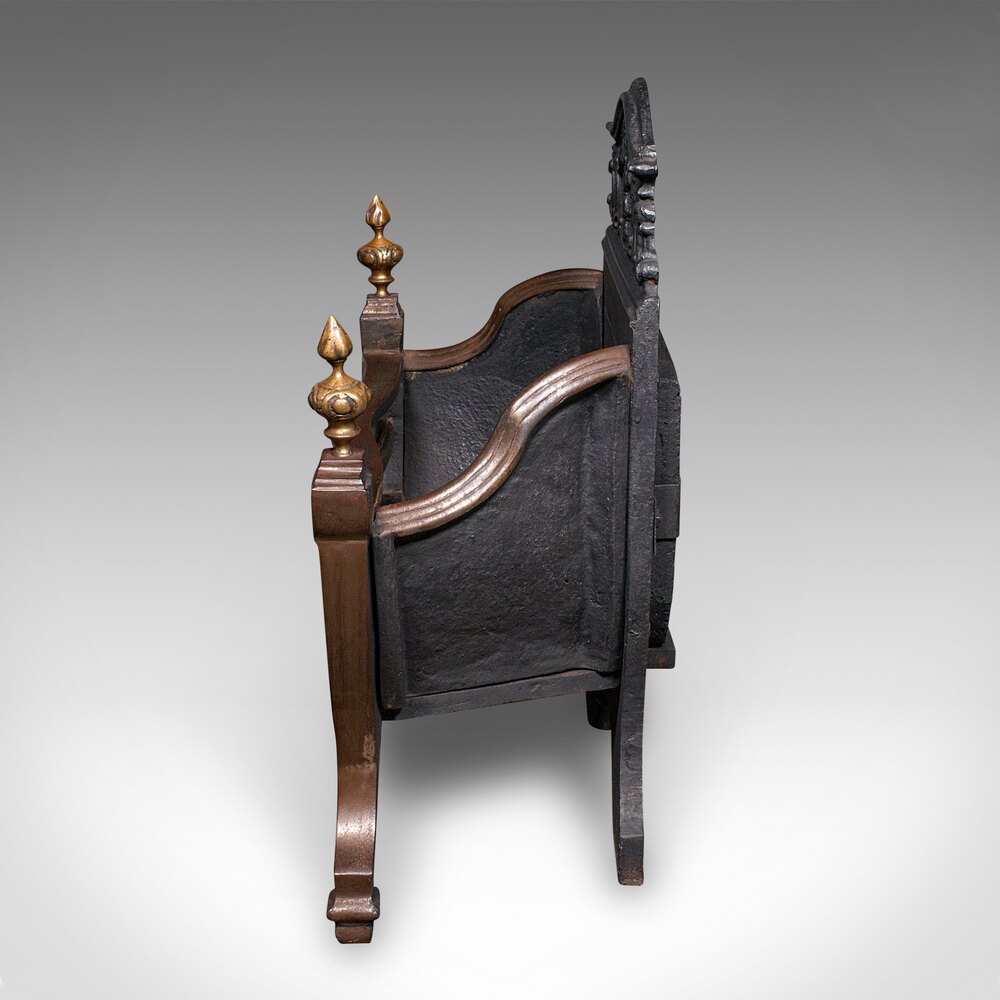 This is an antique free-standing fire basket. An English, cast iron, brass and steel decorative hearth in Georgian revival taste, dating to the late Victorian period, circa 1900. A wonderful example of period craftsmanship, presenting a balanced form, attractive detailing, and appealing material contrast. The proportion and form is ideal for the traditional fireside.