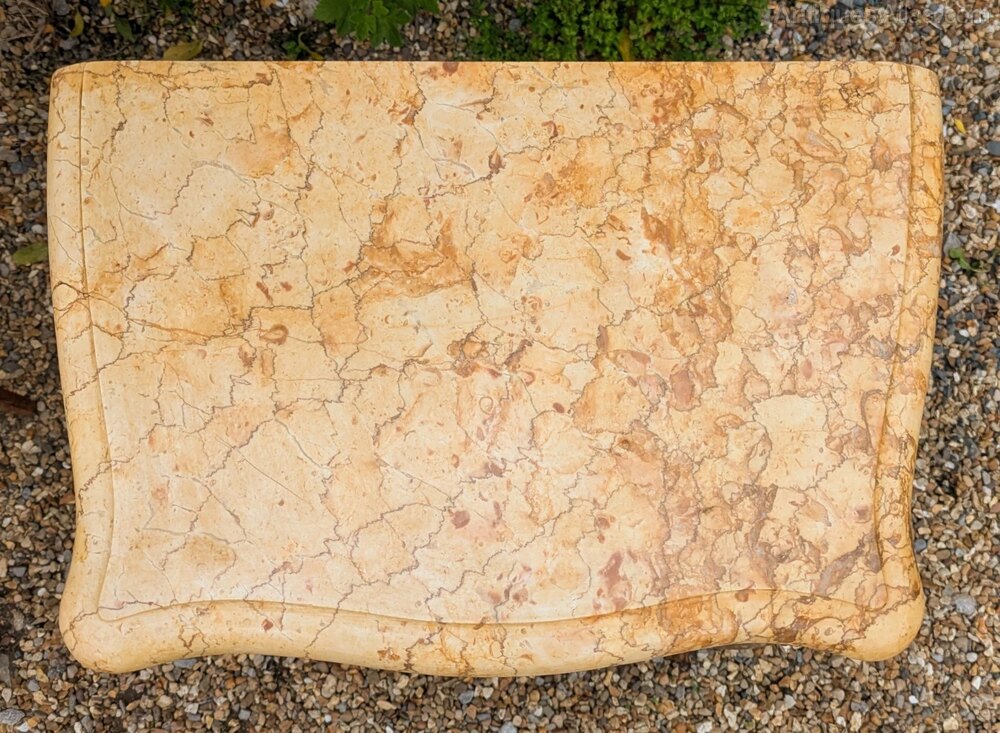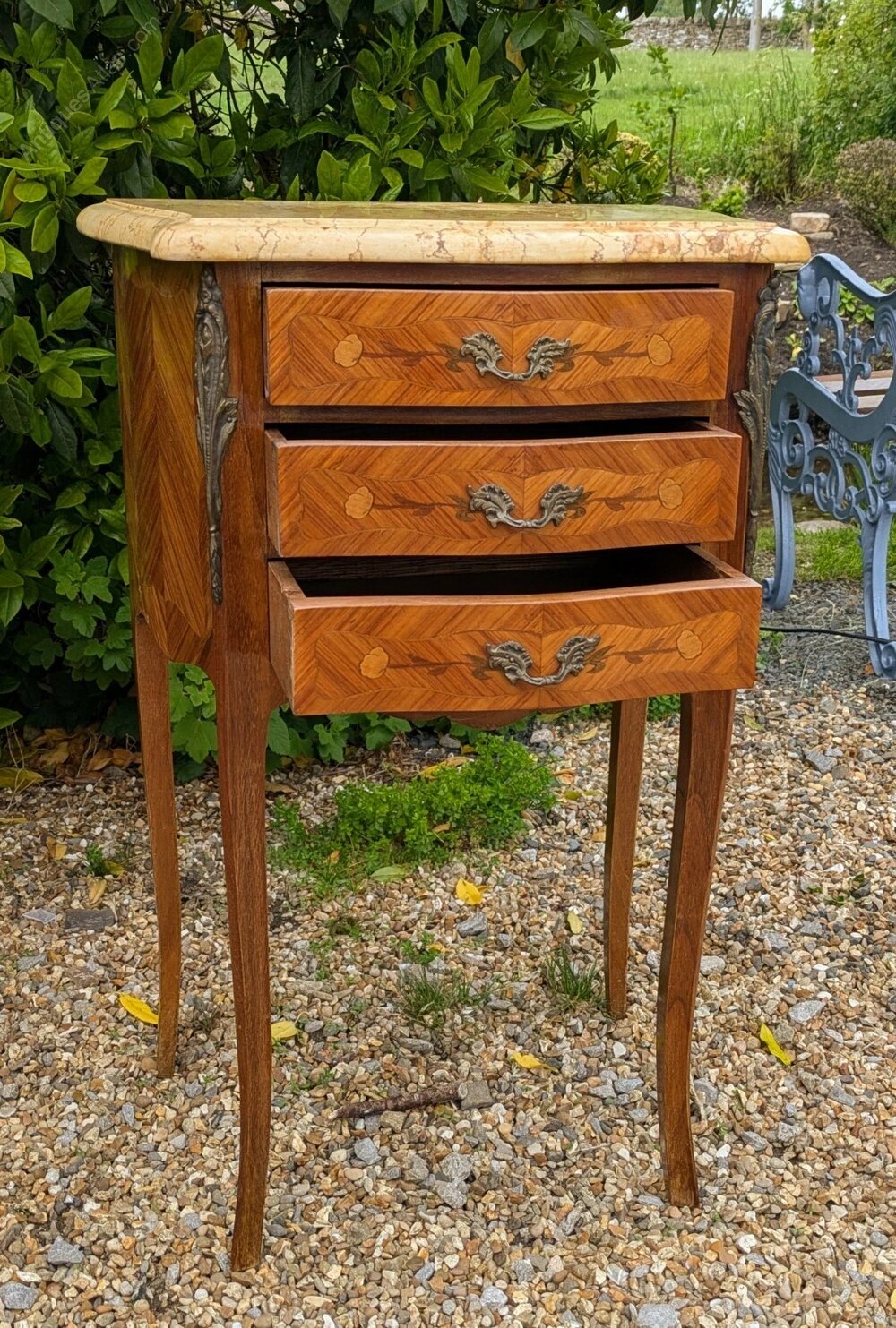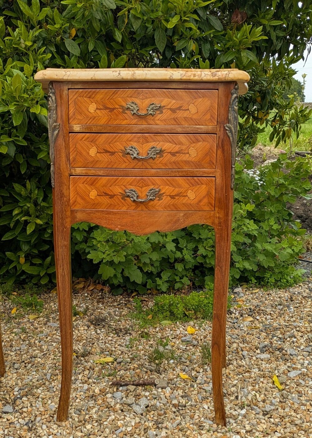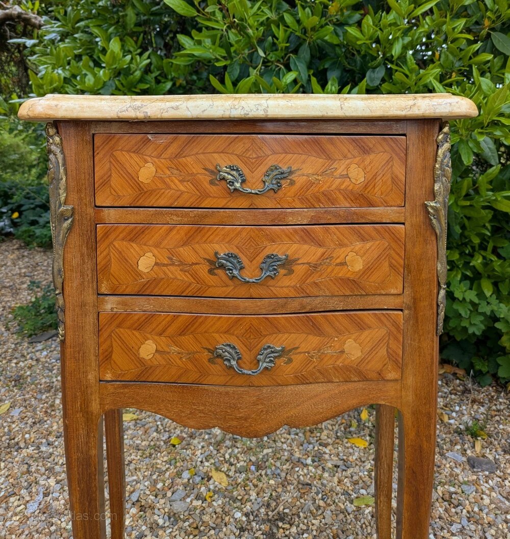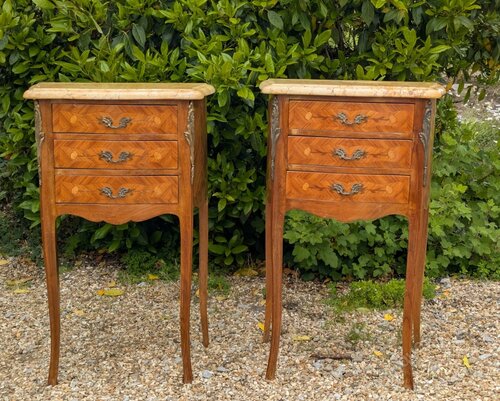 The pair have three useful drawers to the cabinet with attractive inlaid detail and their original cast ormolu handles and decorative mounts. The slender curved cabriole legs give these an attractive appearance and both have pretty, pale Jaune marble tops both in nice clean condition, one with old historic repair that’s hardly noticeable and quite sound.