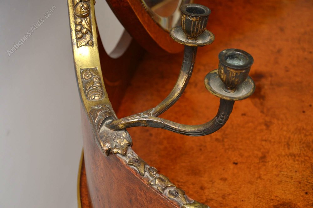 This stunning antique French dressing table is very high quality & has fabulous features. The wood looks like a very tight burr walnut, but it could be something more exotic like Amboyna. We have had it polished, however there is natural ageing showing mainly on the top, which give it more character & in keeping with the rest of this piece. The well defined gilt bronze mounts, candle holders, feet & handles are amazing quality. Please enlarge the images to see how nice they are. You will see that the gilding has rubbed in places & you can see the bronze underneath. See the amazing detail everywhere, especially the floral decoration running up either side. It’s even on the tighteners for the mirror & on the feet. The adjustable mirror is bevelled & there are three drawers in the table, with lovely handles. The back is all polished too & the mirror can be taken off when transporting. I would say this dressing table days to around the 1890-1900 period & it’s in good condition all over.