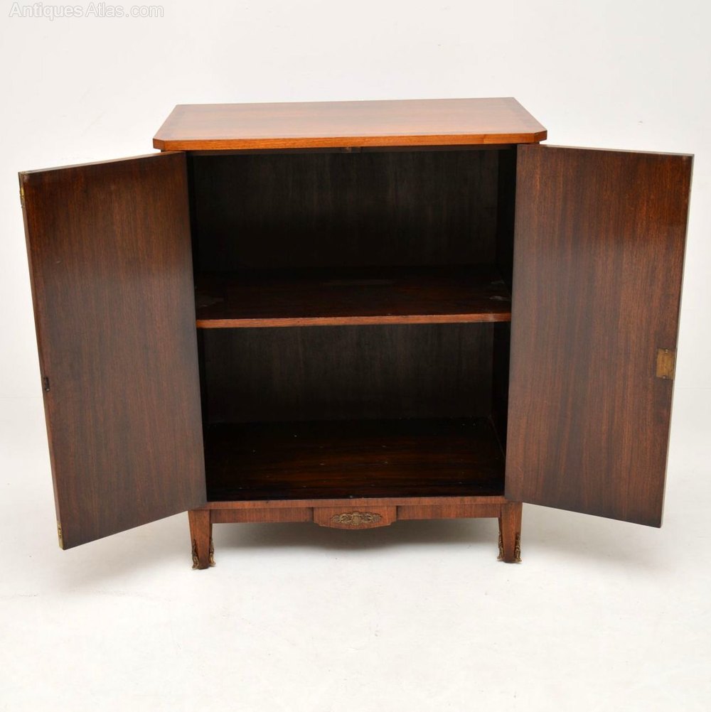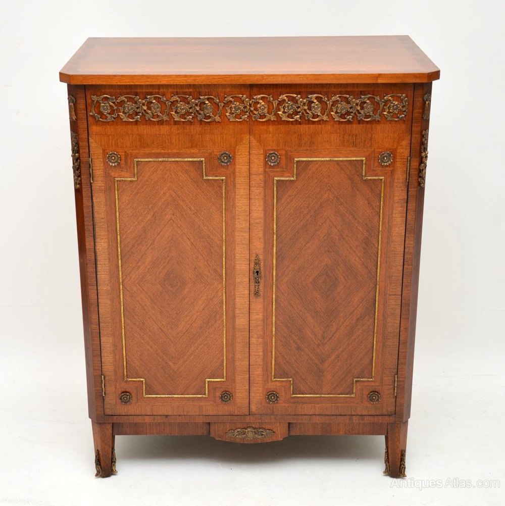 Antique French Kingwood & walnut cabinet in excellent condition, with plenty of storage inside. This cabinet has some fine gilt bronze mounts in various places on the front & canted corners. I would date it to around the 1920-30’s period.