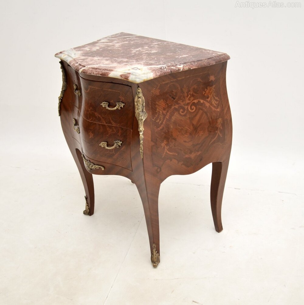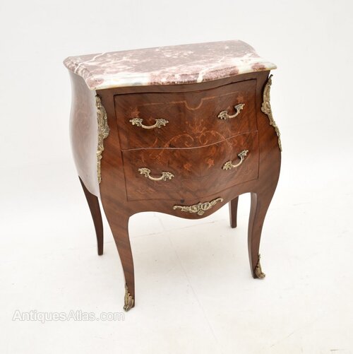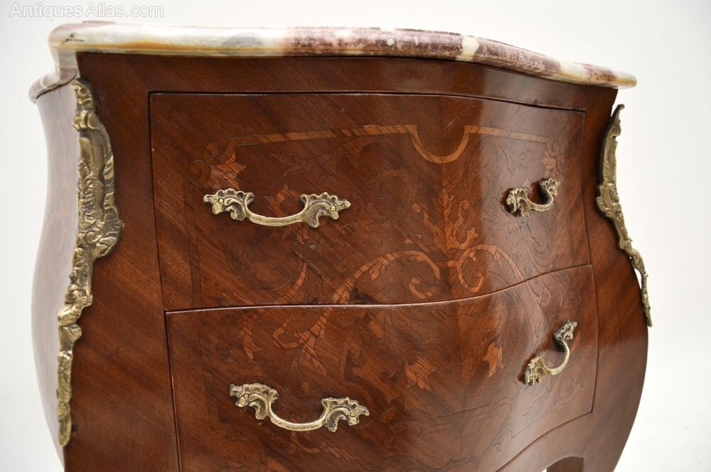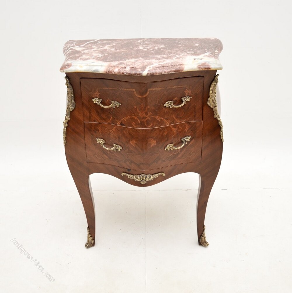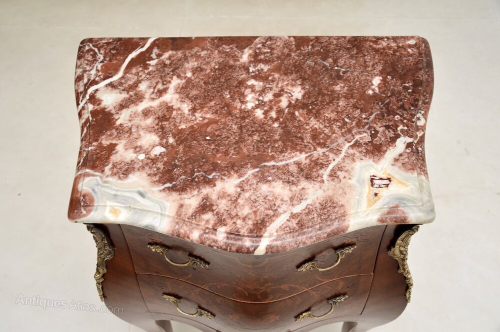 It is of great quality and is a lovely size, perfect for use as a bedside chest or as an occasional chest / side table around the home. This has beautiful inlaid marquetry and bronze ormolu mounts, the serpentine marble top has absolutely gorgeous colour tones.
