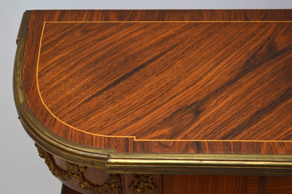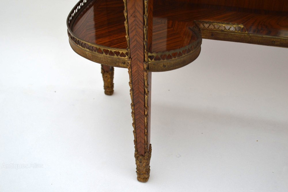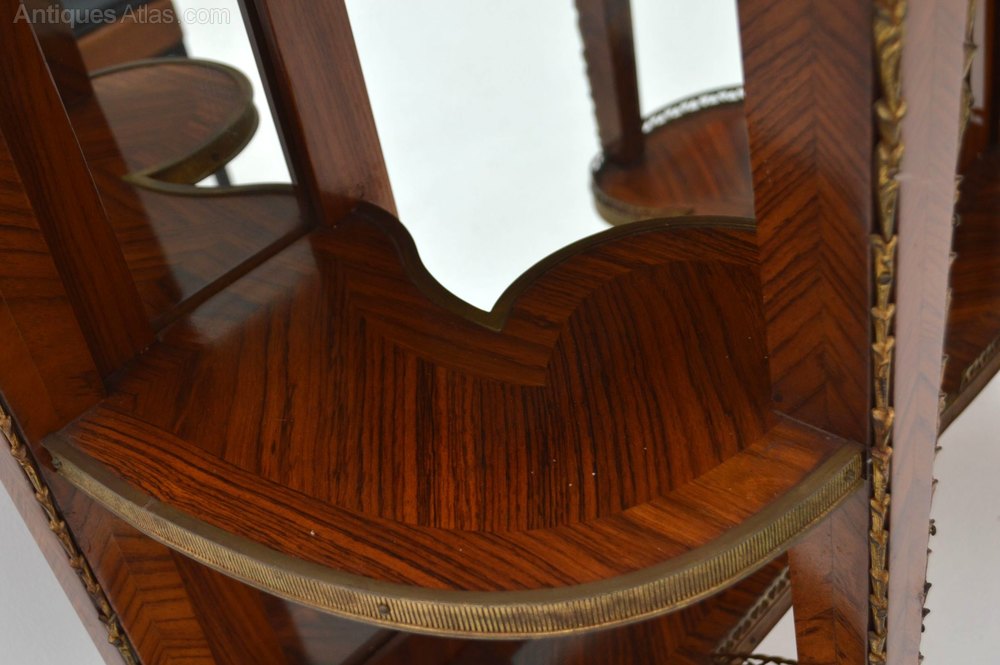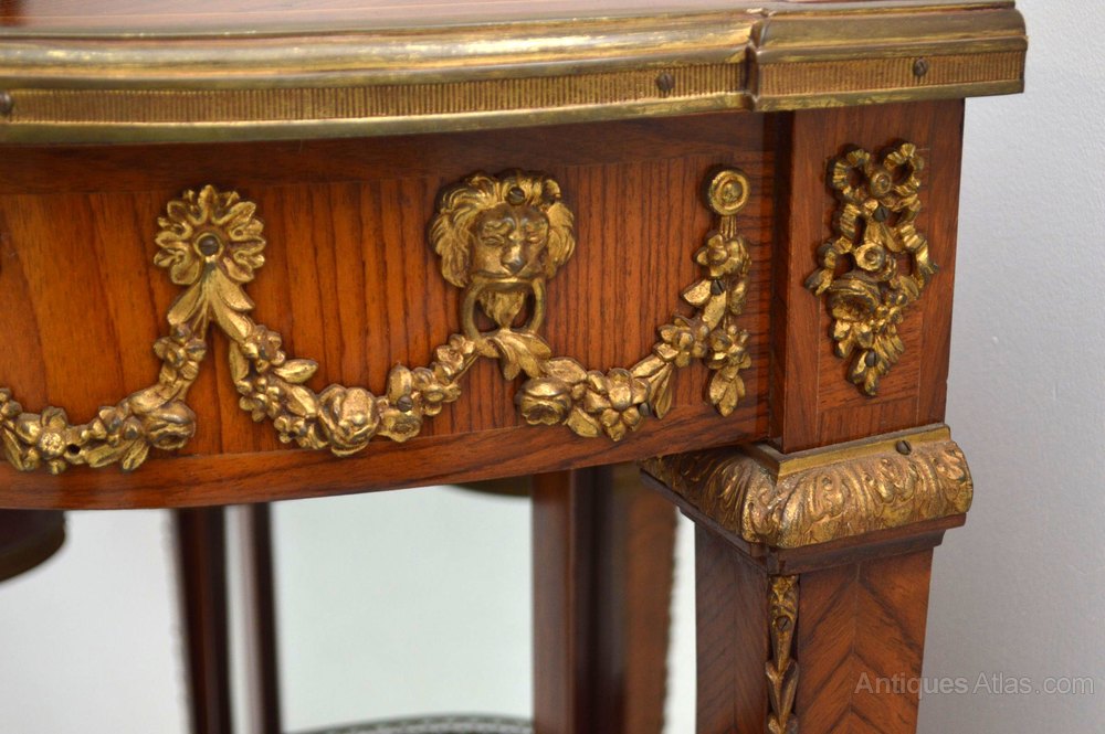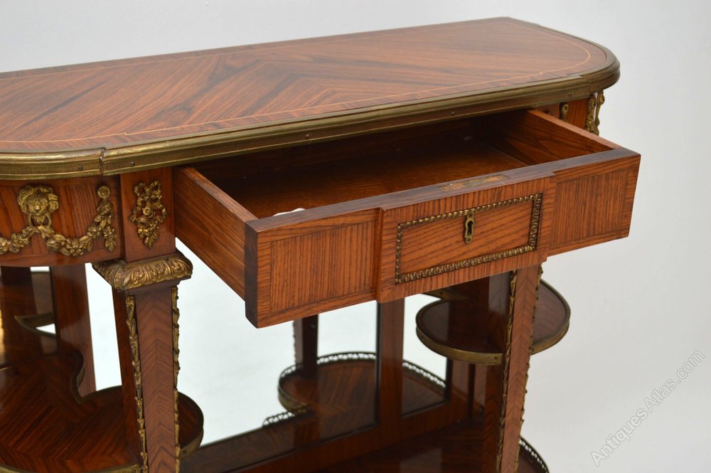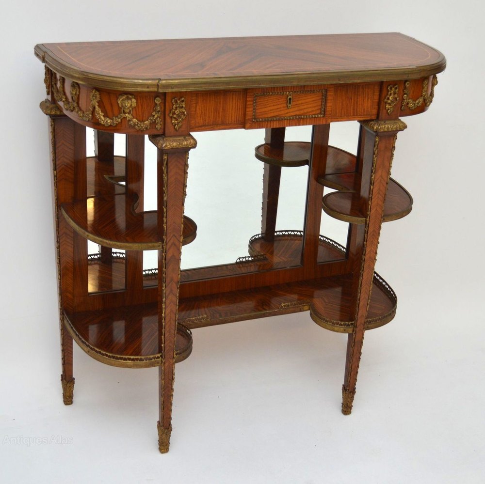 Very imposing antique French Kingwood console side table, with a mirror attached on the back. This table is smothered with gilt bronze mounts, pierced galleries & feet, all of which are of the highest quality, so please zoom in on all the images to appreciate this. The Kingwood veneers also have very striking patterns. There is a single drawer, with a working key & there are 2 levels of shaped shelves below the top. This table is in excellent condition, having just been polished & I would date it to around the 1920-30's period, although it may be older. It's also a lot higher than the average console.