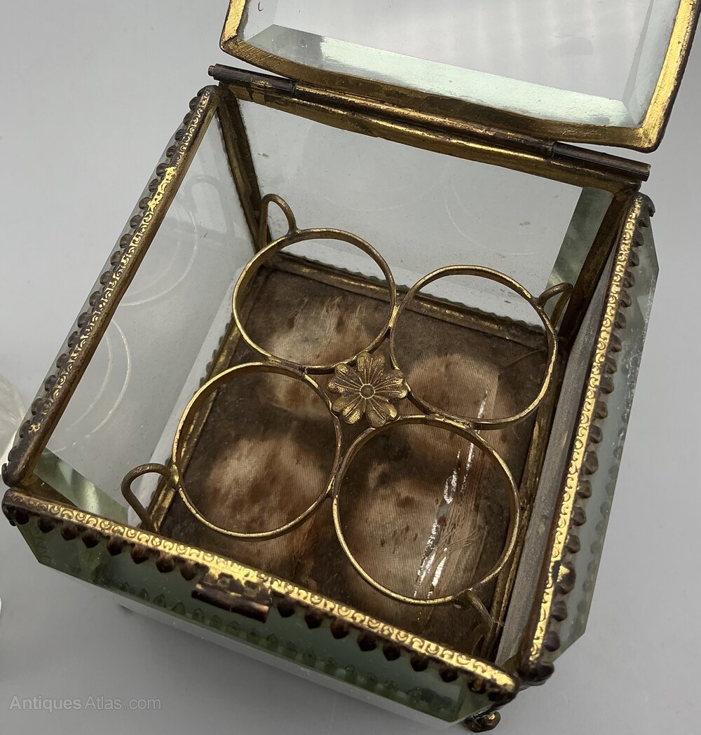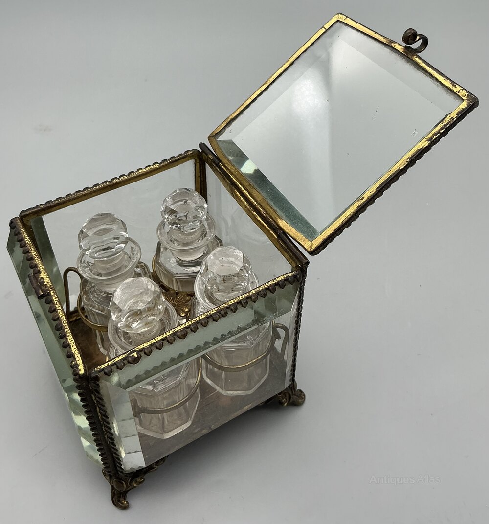 A rare and elegant French scent case dating from the late 19th century, crafted in ormolu and glass. The hinged case opens to reveal four original scent bottles, each designed to hold precious perfumes. Exquisite detailing and fine craftsmanship make this a stunning example of Victorian/French decorative artistry.