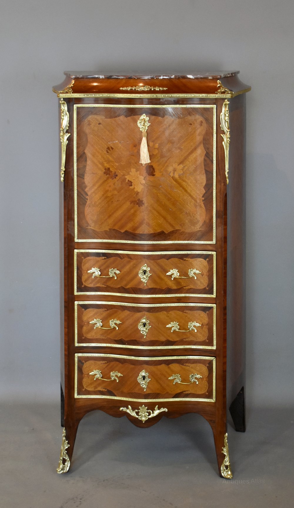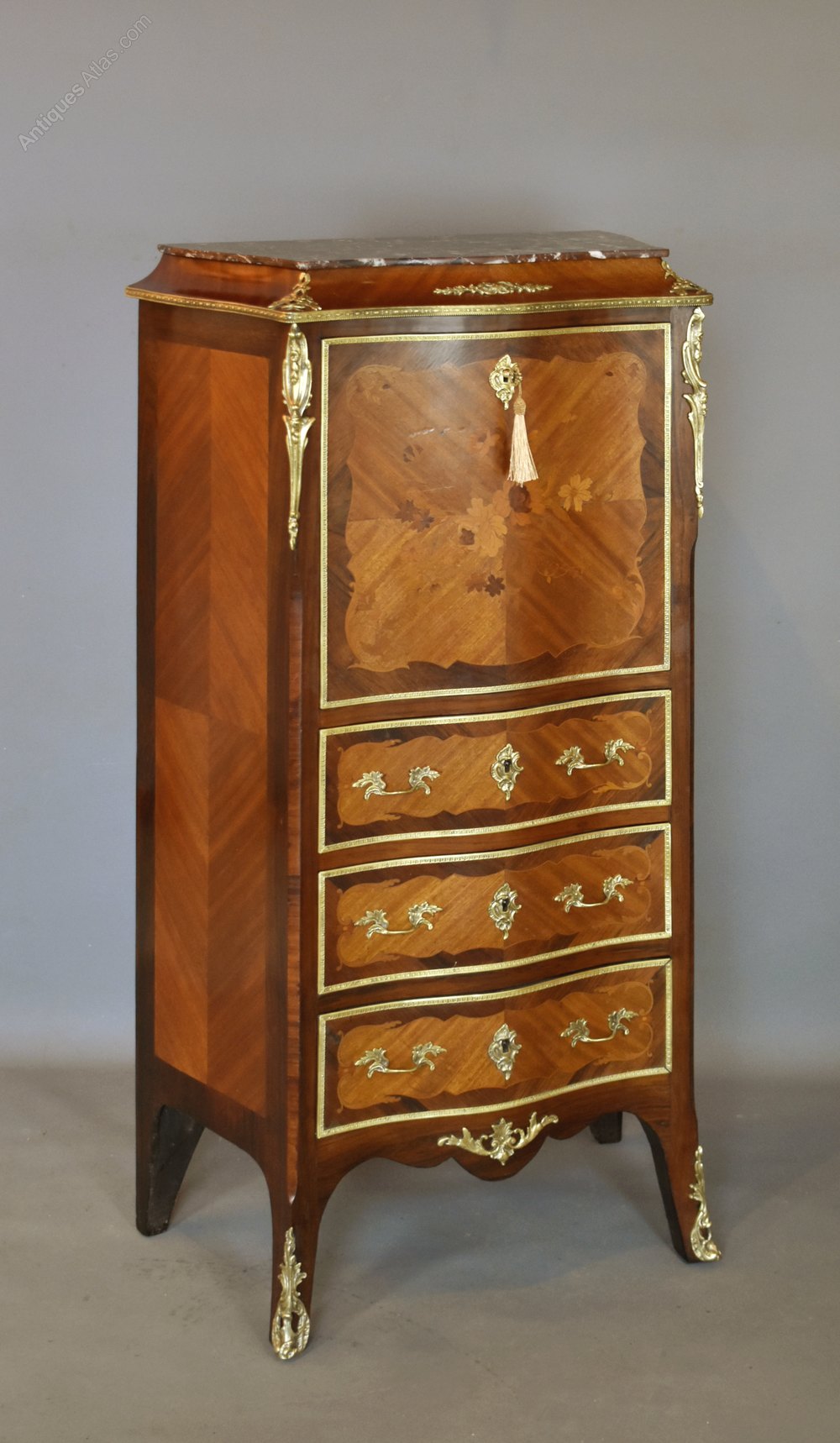 Below are three full-width drawers with serpentine fronts and inlaid with marquetry panels.