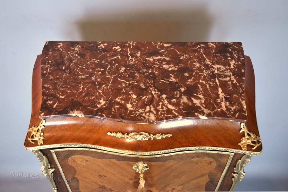 The marble top sits on a curved shaped frieze, below which there is a fall-fronted compartment inlaid with floral marquetry decoration.