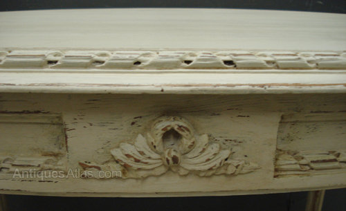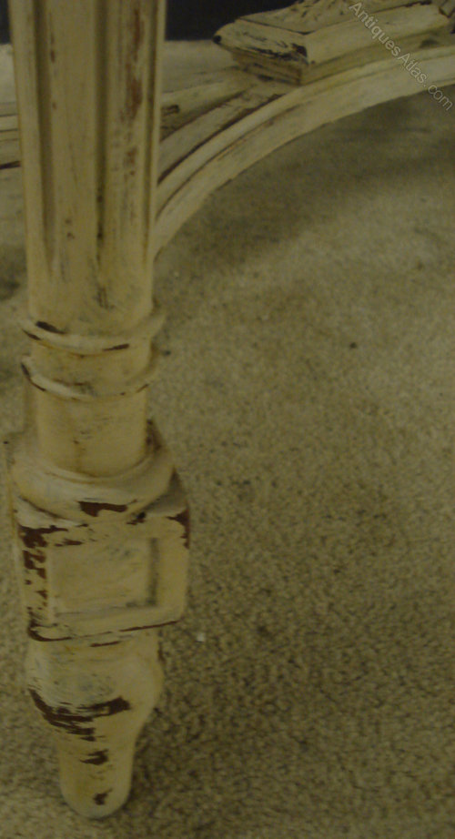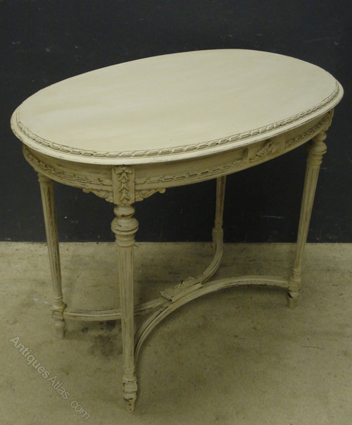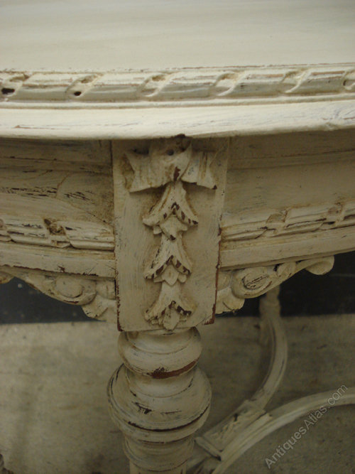 Ref 4922 - Worn cream painted French antique oval table with carved wood decoration. Circa 1900.