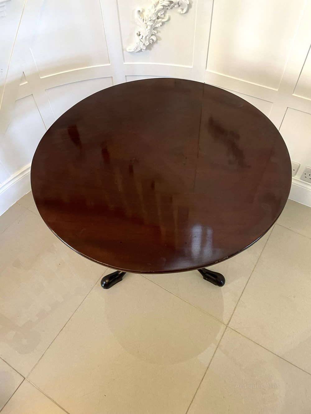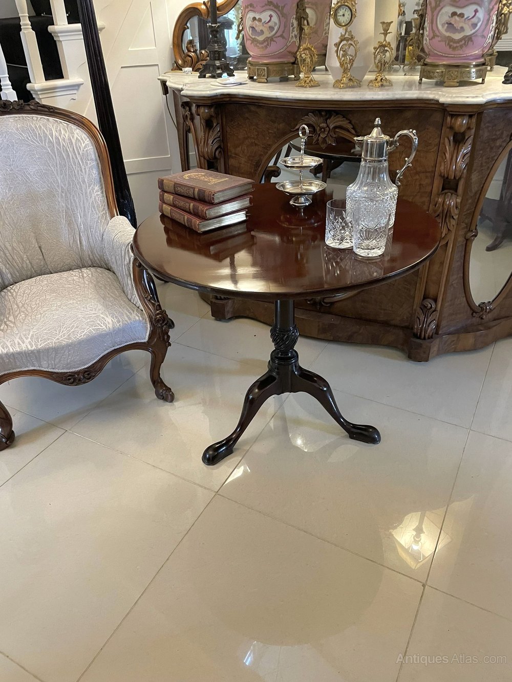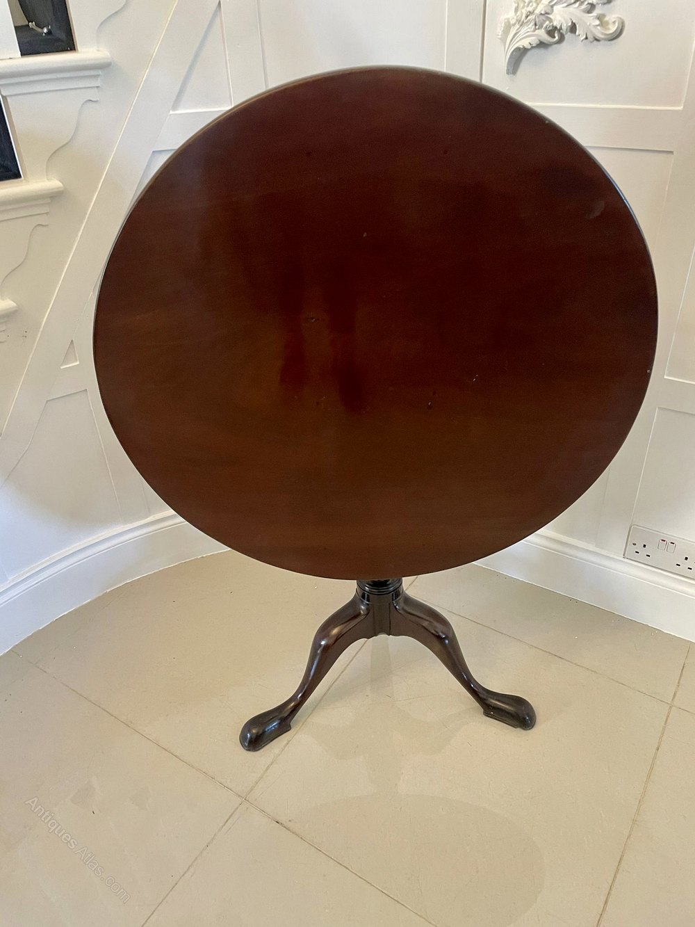 Antique George III quality mahogany circular centre table having a quality circular mahogany tilt top supported on a turned and twist collar, pedestal column raised on three shaped cabriole legs with pad feet.
