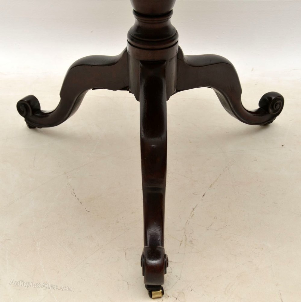 This is a fine quality antique period solid mahogany George III tripod based table in very good condition & dating to around the 1790 period or a bit earlier. It’s actually quite a useful size & could be used as a small dining table. The tripod legs have an unusual upturn on the ends & also have brass casters which I think could be original.