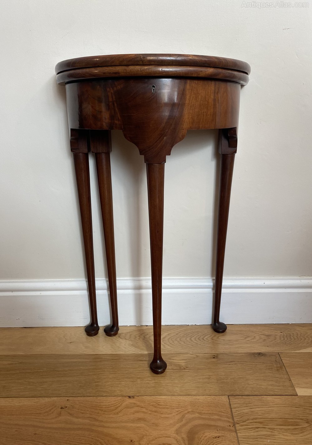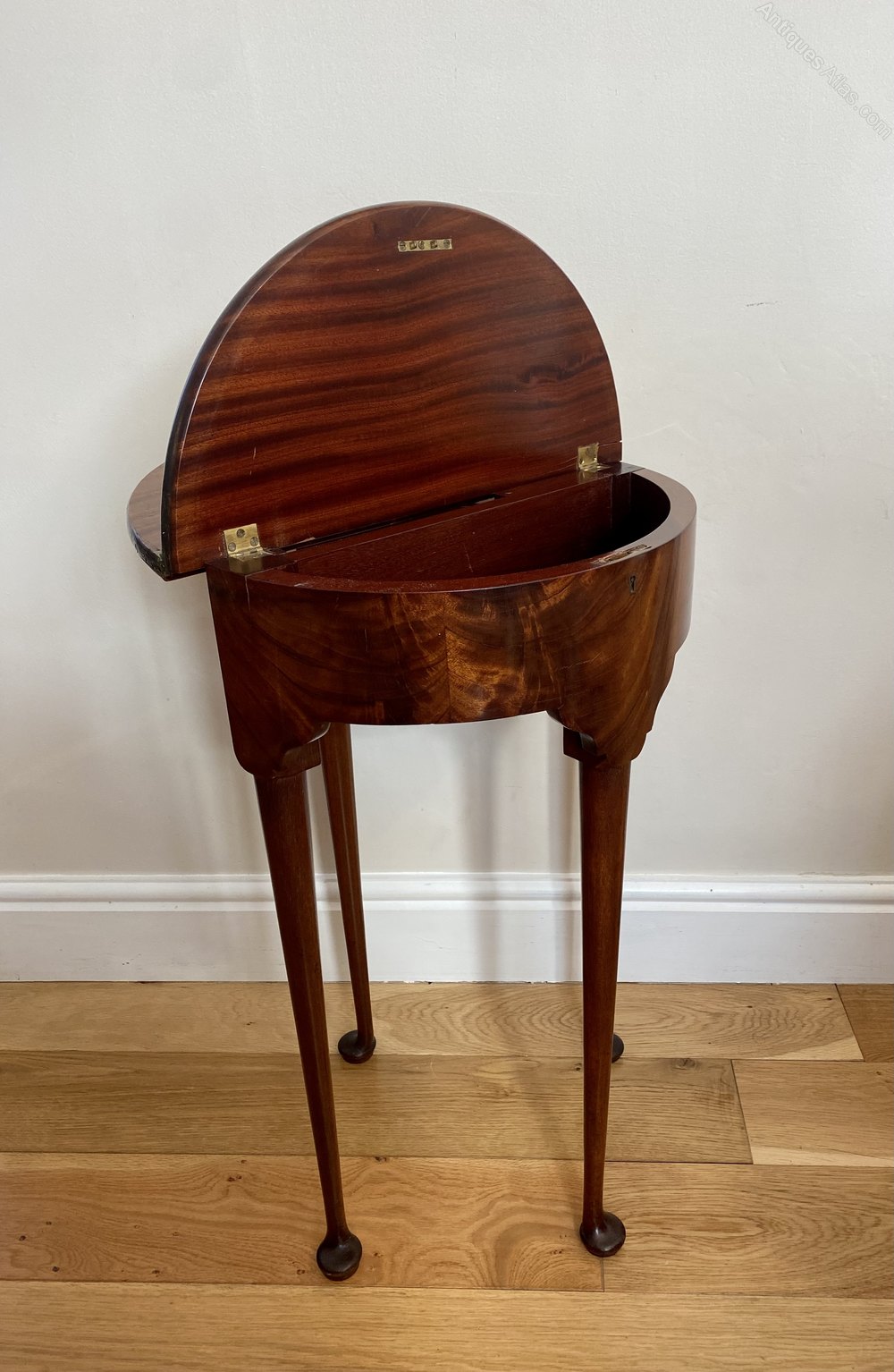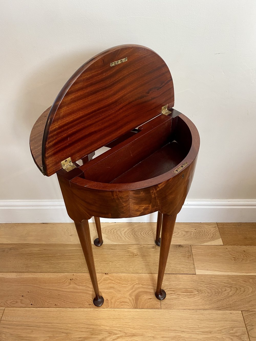 Antique George III quality mahogany lamp table having a quality mahogany folding top opening to reveal a polished interior and storage compartment, figured mahogany frieze standing on four shaped cabriole legs with pad feet and one swing out back leg
