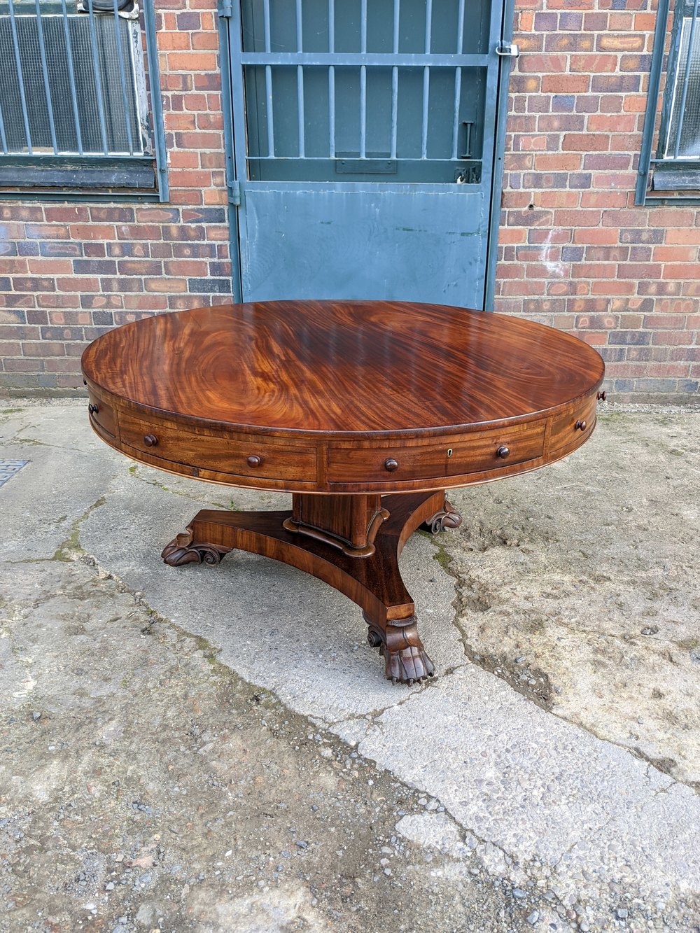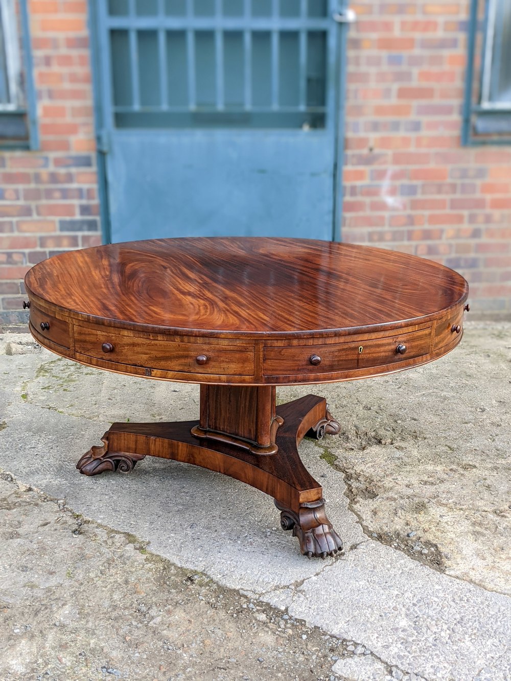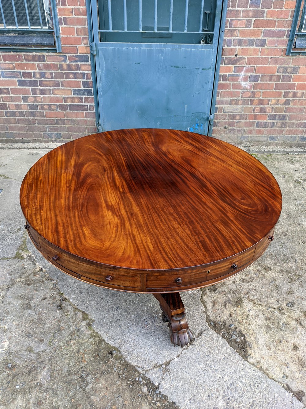A fabulous mahogany drum table or rent table with a superb figured flame mahogany top, triangular pedestal base and large finely carved lion paw feet with original castors