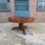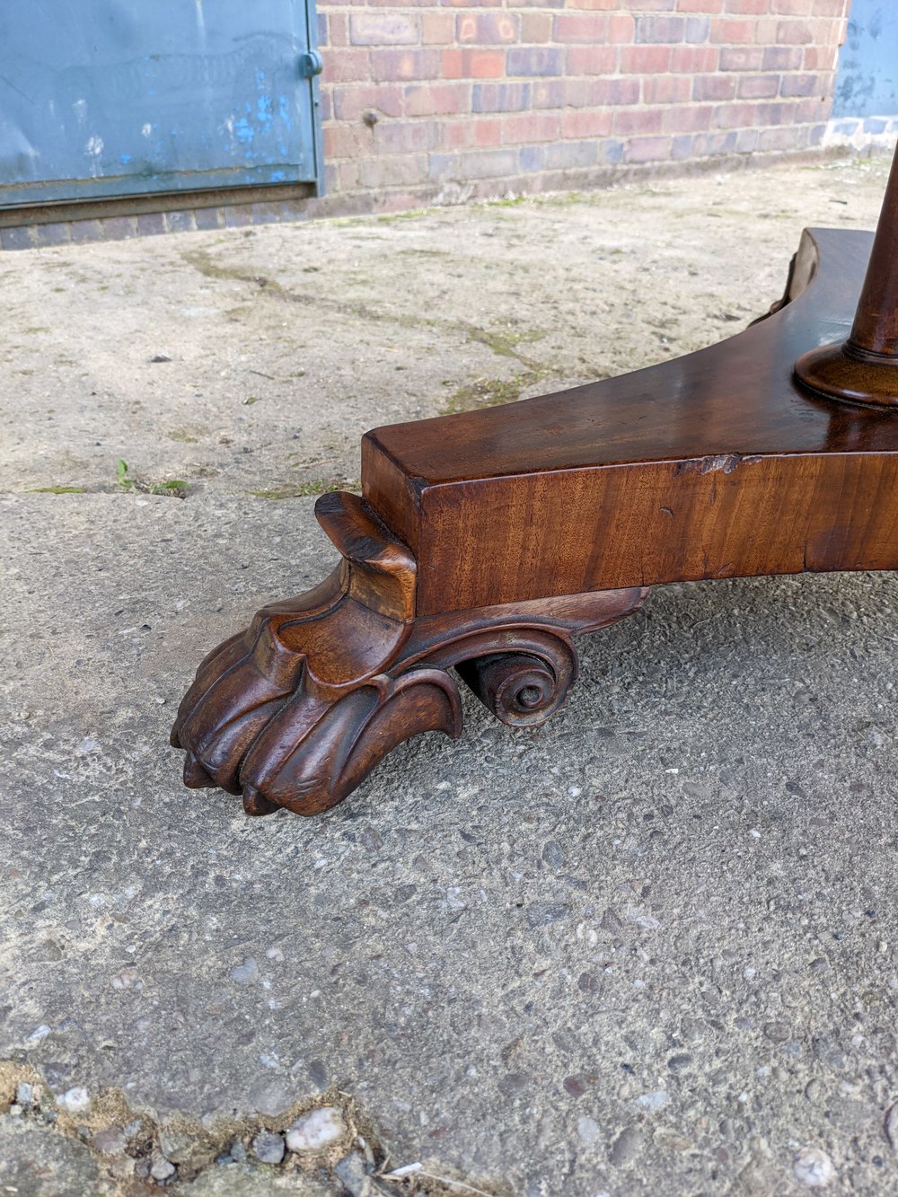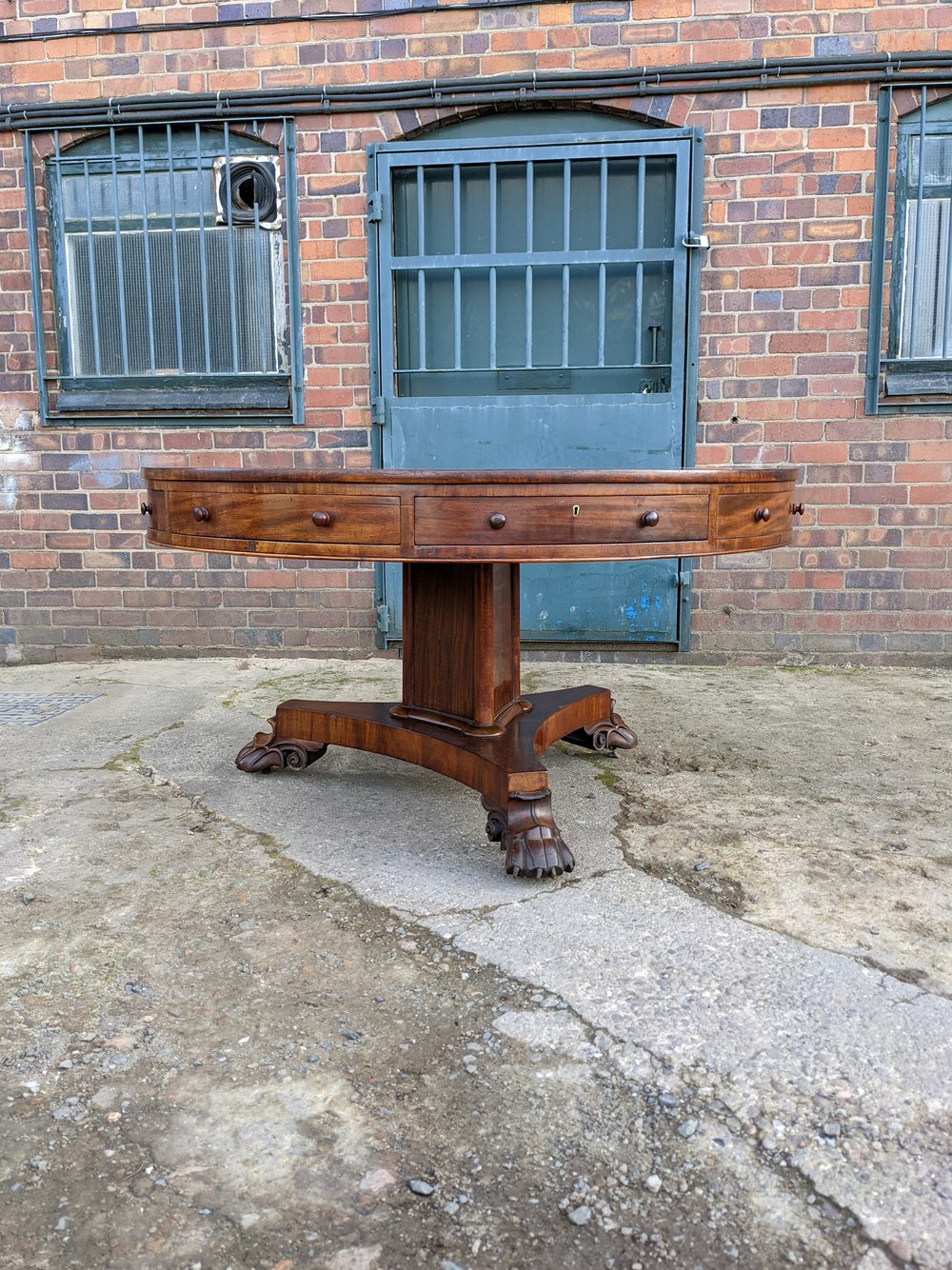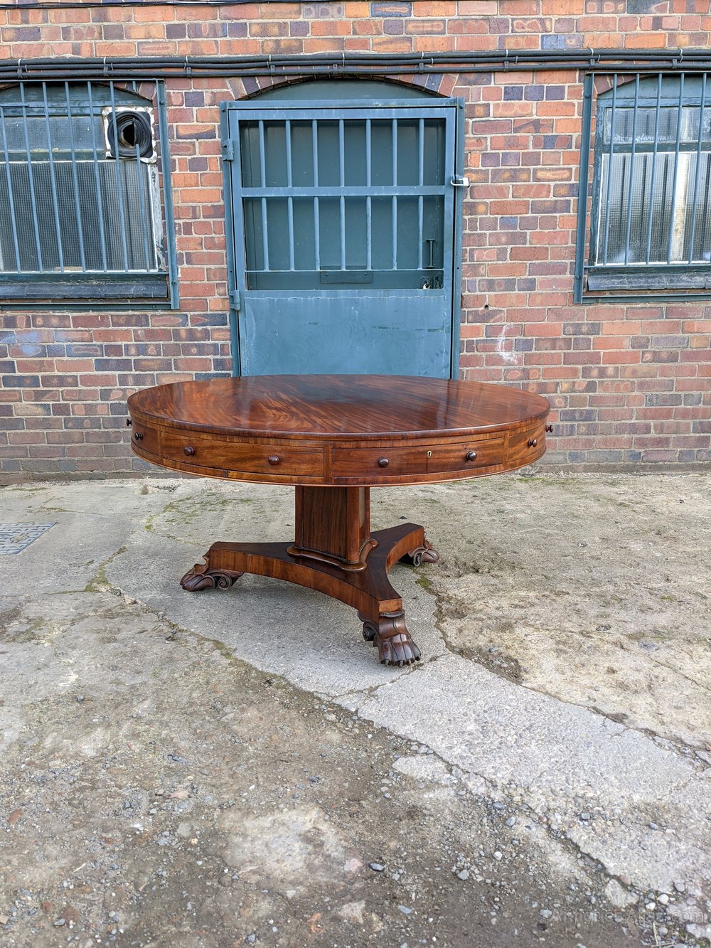 A fabulous mahogany drum table or rent table with a superb figured flame mahogany top, triangular pedestal base and large finely carved lion paw feet with original castors