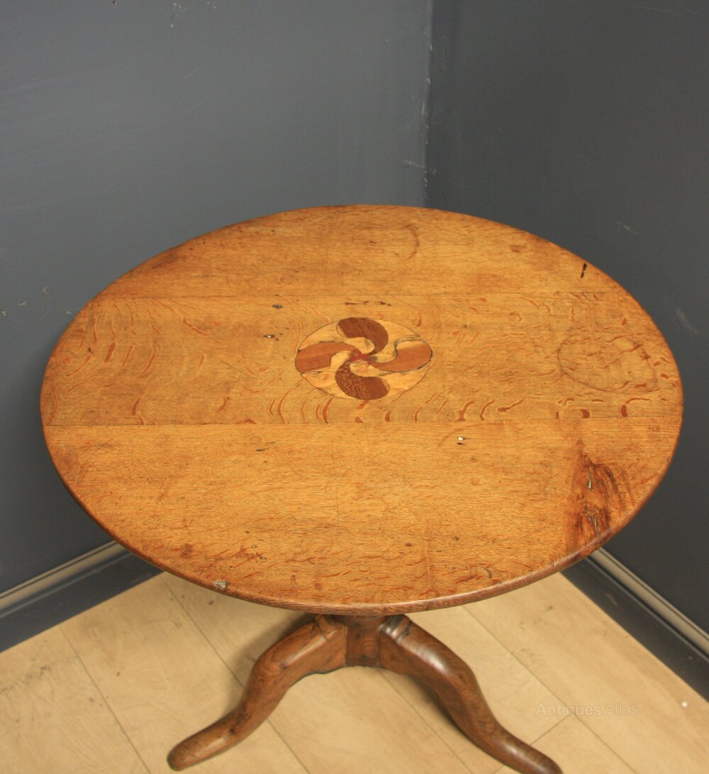Good quality Georgian oak having solid circular top with decorative inlay over turned pedestal over tripod base with shaped cabriole legs.