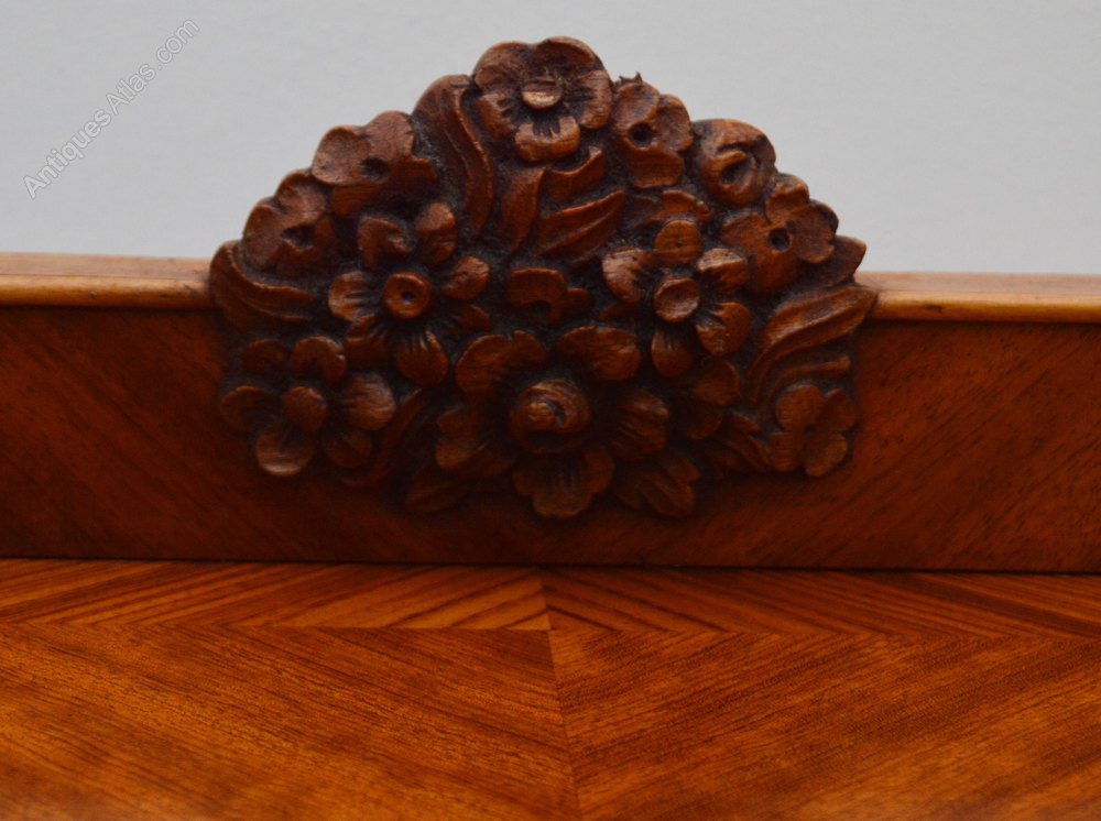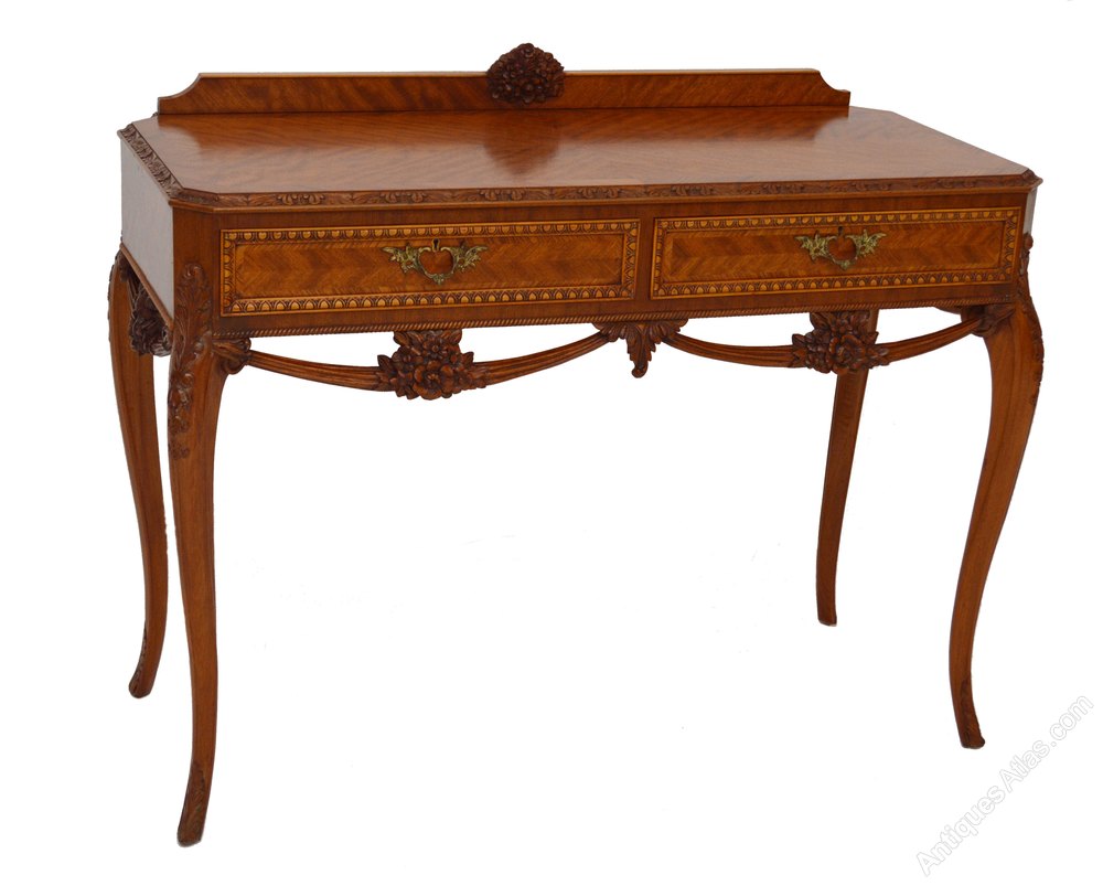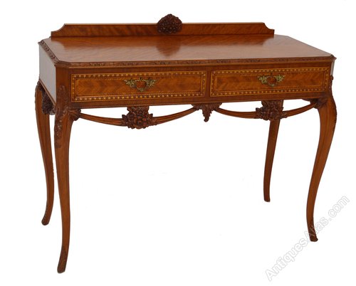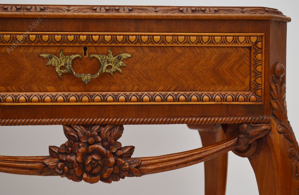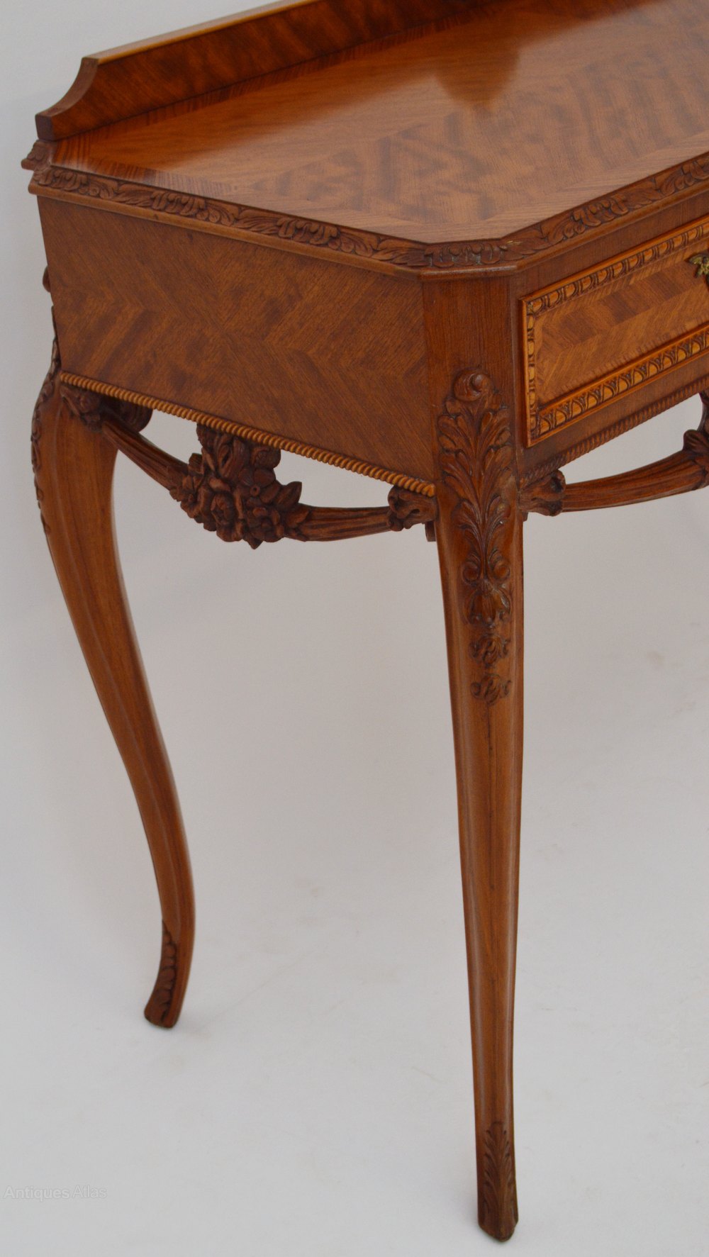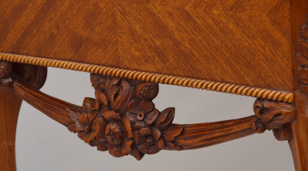This antique French style console or side table has some beautiful carving & is in good condition. It must have had a silver cutlery set inside the drawers, because as you can see, they are all fitted out with the baize cutlery holders. I suppose one could take them out & leave the drawers empty, but they could come in useful. I would date this piece to around the 1920-30's period. I think the wood is a combination of Kingwood & walnut. Please enlarge all the images to appreciate the quality of the carving.
