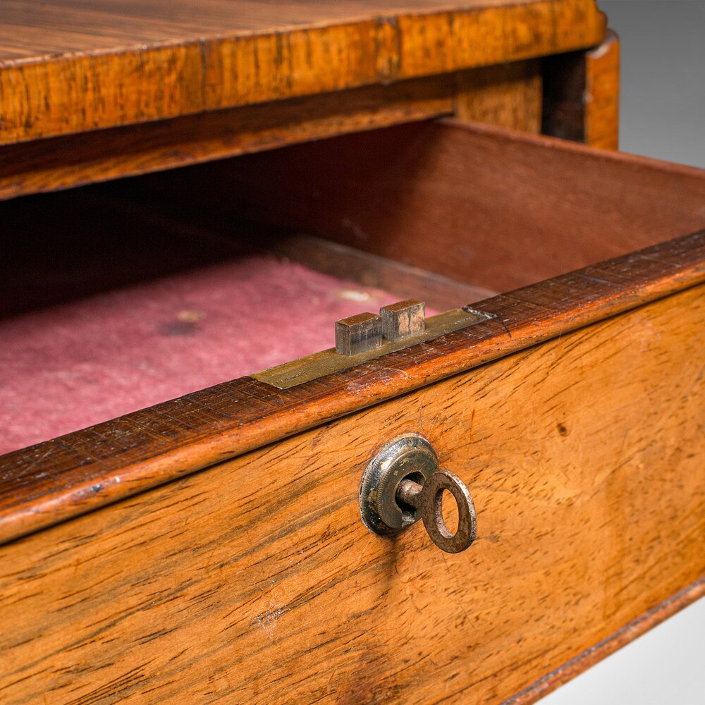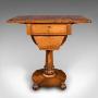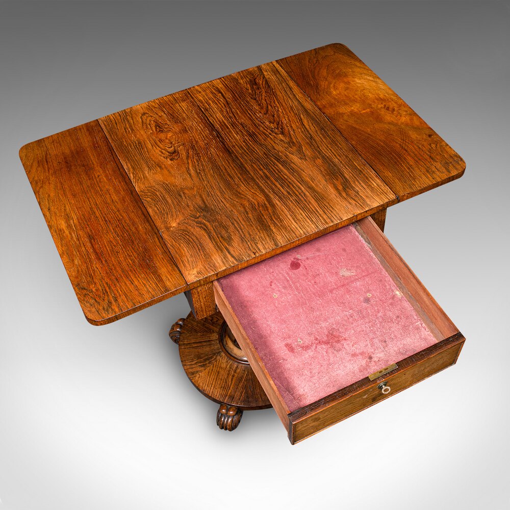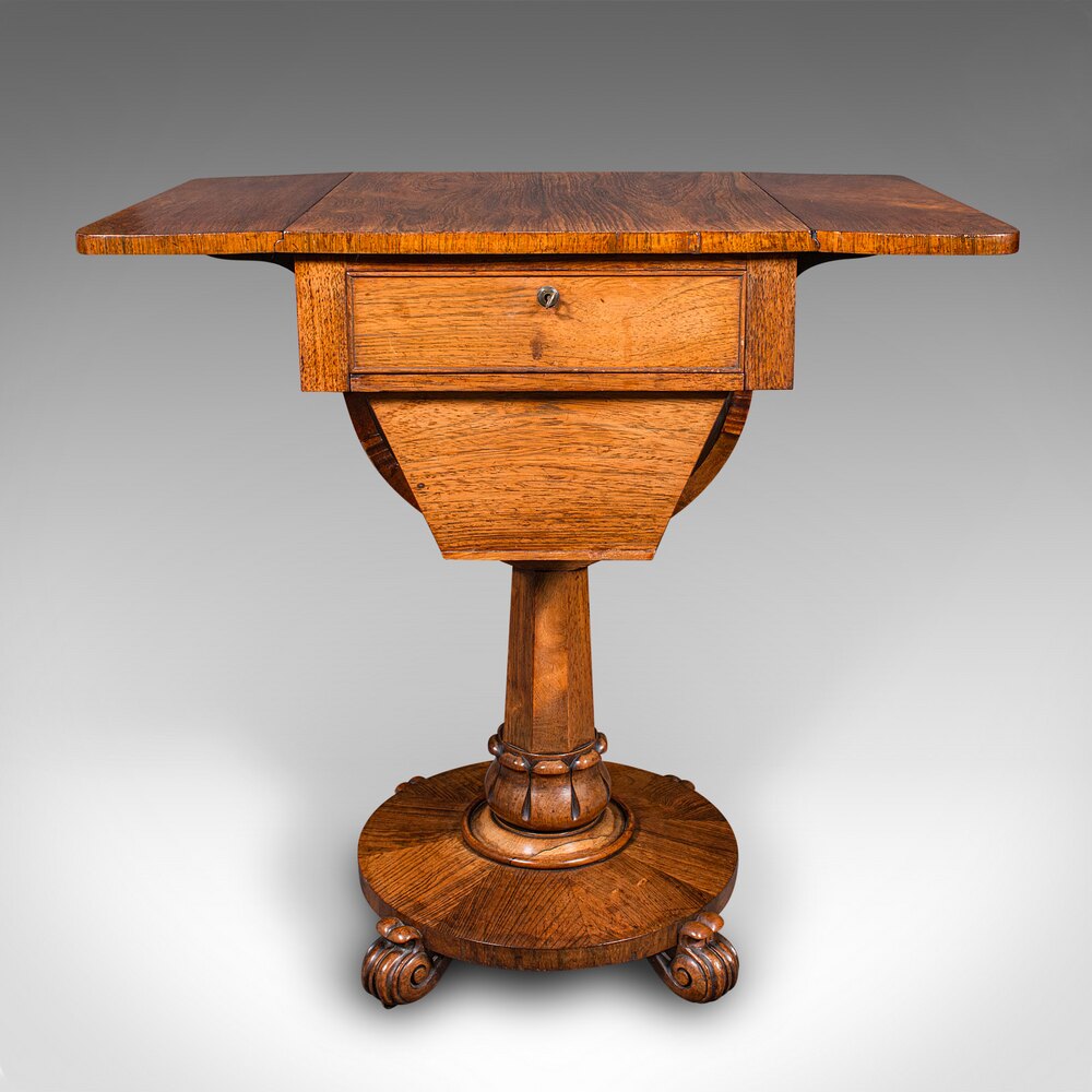 A fine and versatile William IV work table, this piece demonstrates the quality and poise of English furniture from the early 19th century. With its drop-leaf versatility, storage practicality, and elegant form, it will lend distinction and charm to any traditional or eclectic interior. Solid joints and construction, delivered ready for the home.