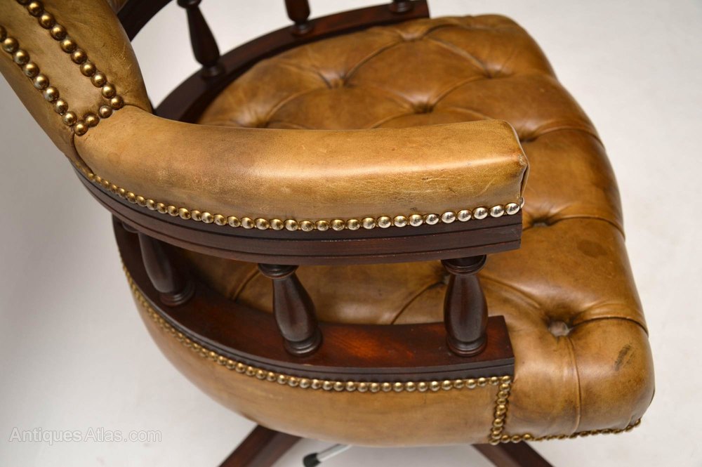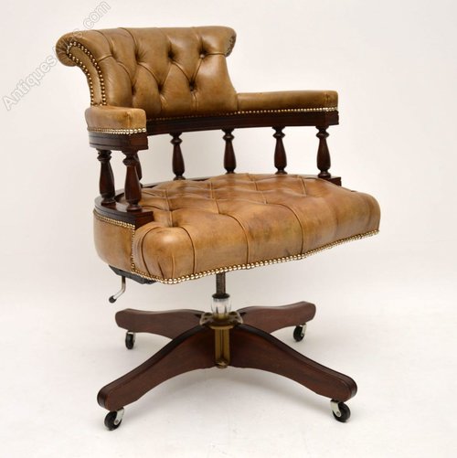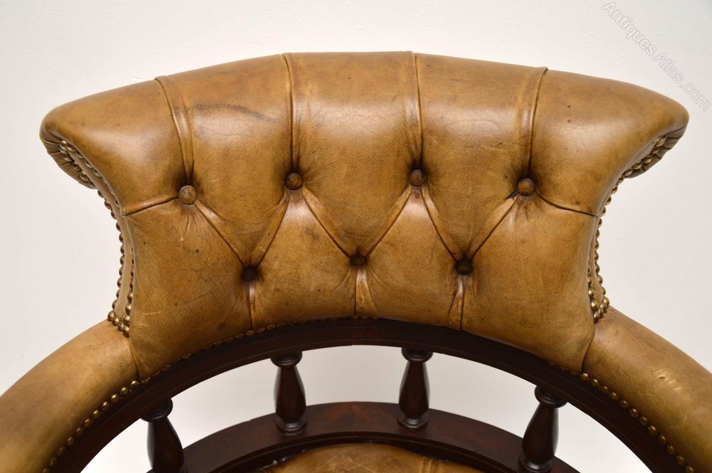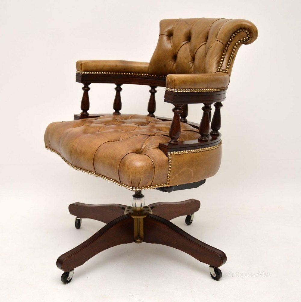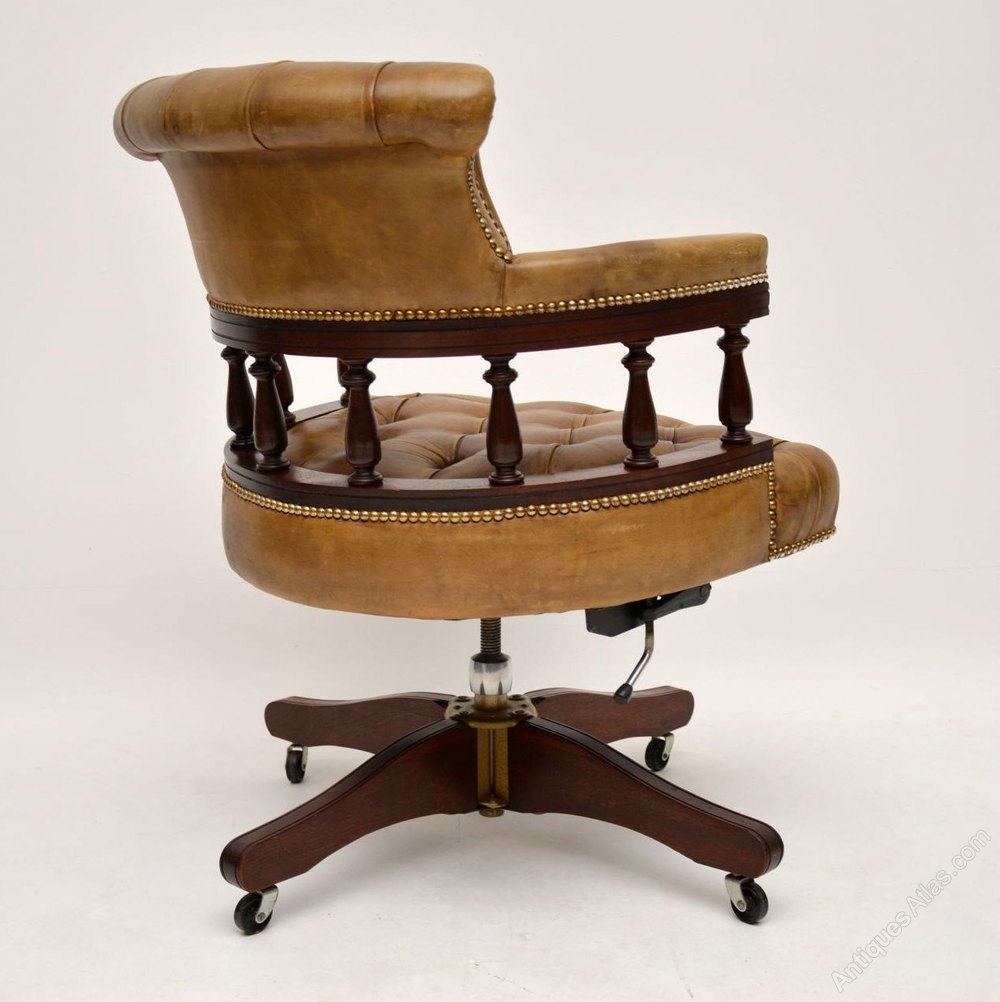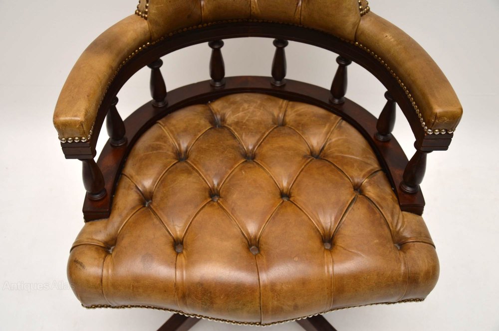Antique Victorian Captains style desk armchair in good condition. This chair swivels, tilts back & can be adjusted in height. The leather is deep buttoned, in good condition & has a wonderful old tan colour. The leather is naturally distressed & is hand tacked on to the mahogany frame. The curved design & upholstery help give this chair plenty of comfort. There are four feet with wheels below. I would date this chair to around the 1950’s period.