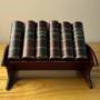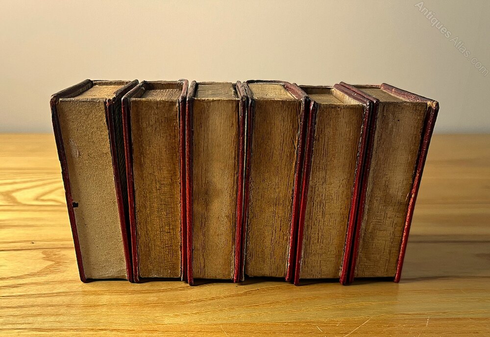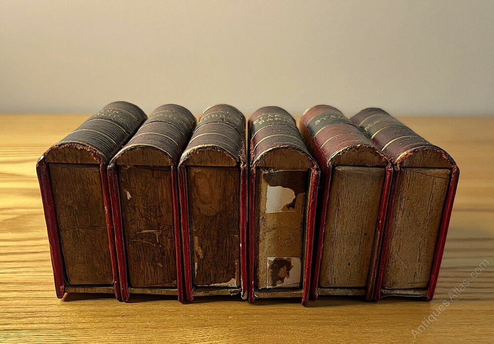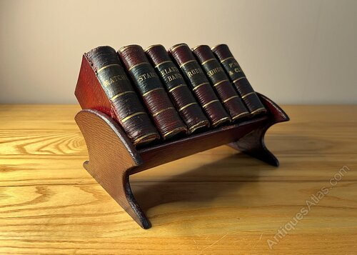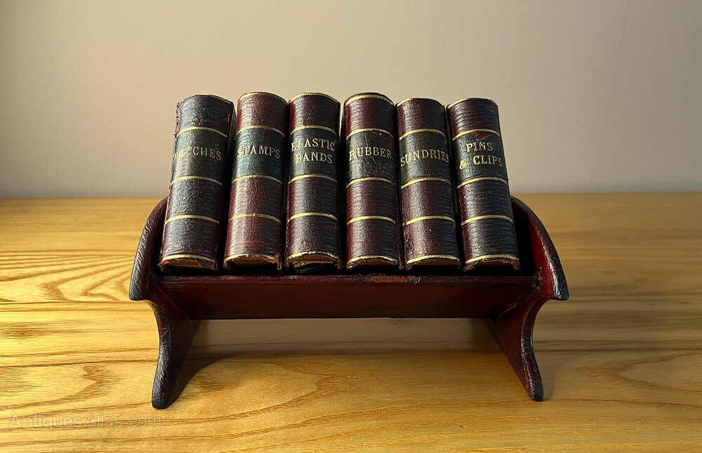 This unusual and very charming desk tidy dates to 1890-1910. Six faux books sit on a red leather book trough. As can be seen in the photos, the books are labelled ‘Matches, Stamps, Elastic Bands, Rubber, Sundries, and Pins & Clips’. The red leather books slide open as would a match box. There are losses to the gilt page edging to one of the books, but this is on the bottom edge of the book (presumably worn through by years of pushing this book open) and can not be seen when the books are in the trough. The book trough measures 15.5 cm wide, 10.5 cm deep, and 6.5 cm high. The height when the books are in place is 11cm. Each book measures 7.8 cm high, 5.8 cm wide, and 2.3 cm in thickness.
