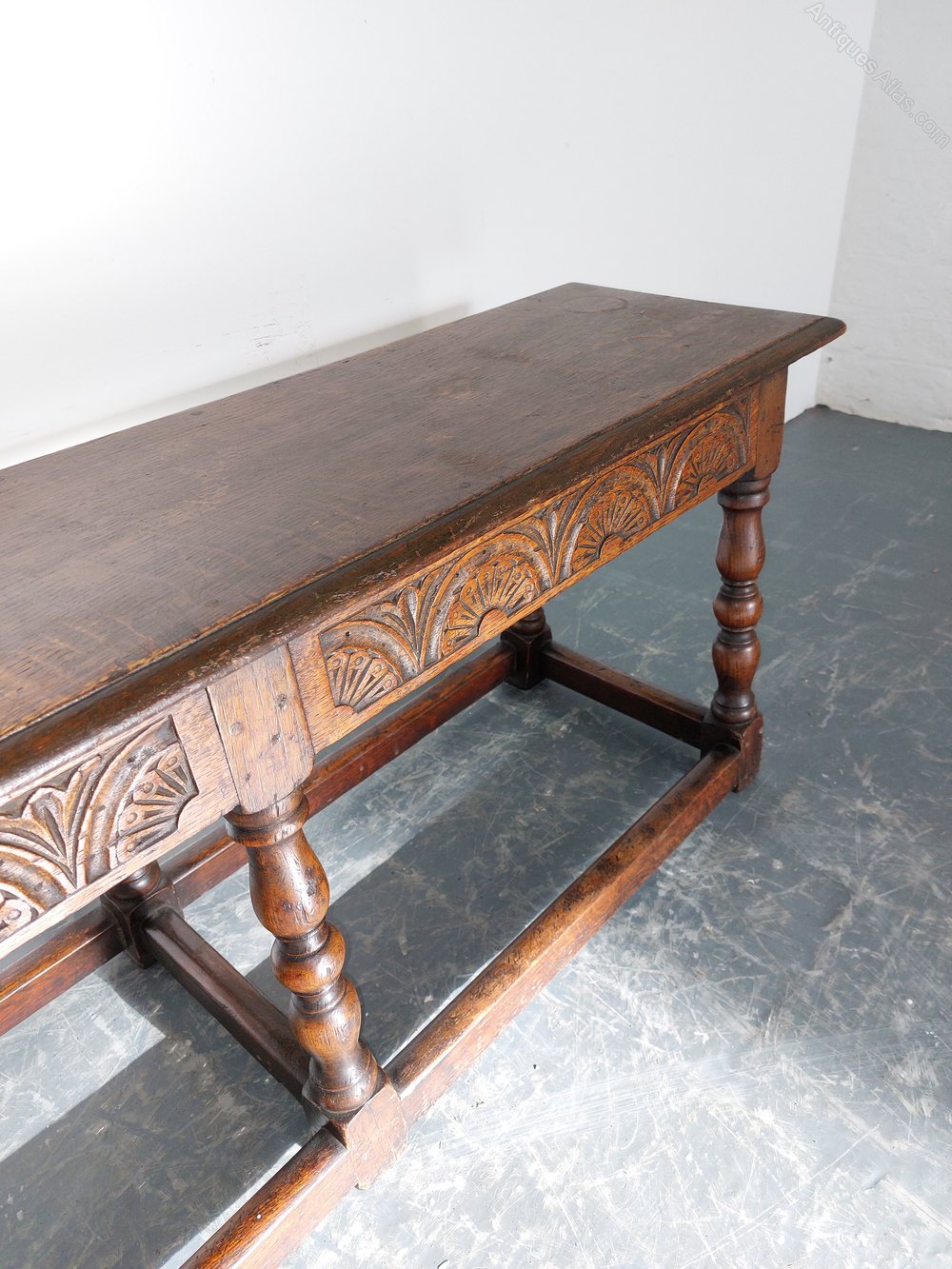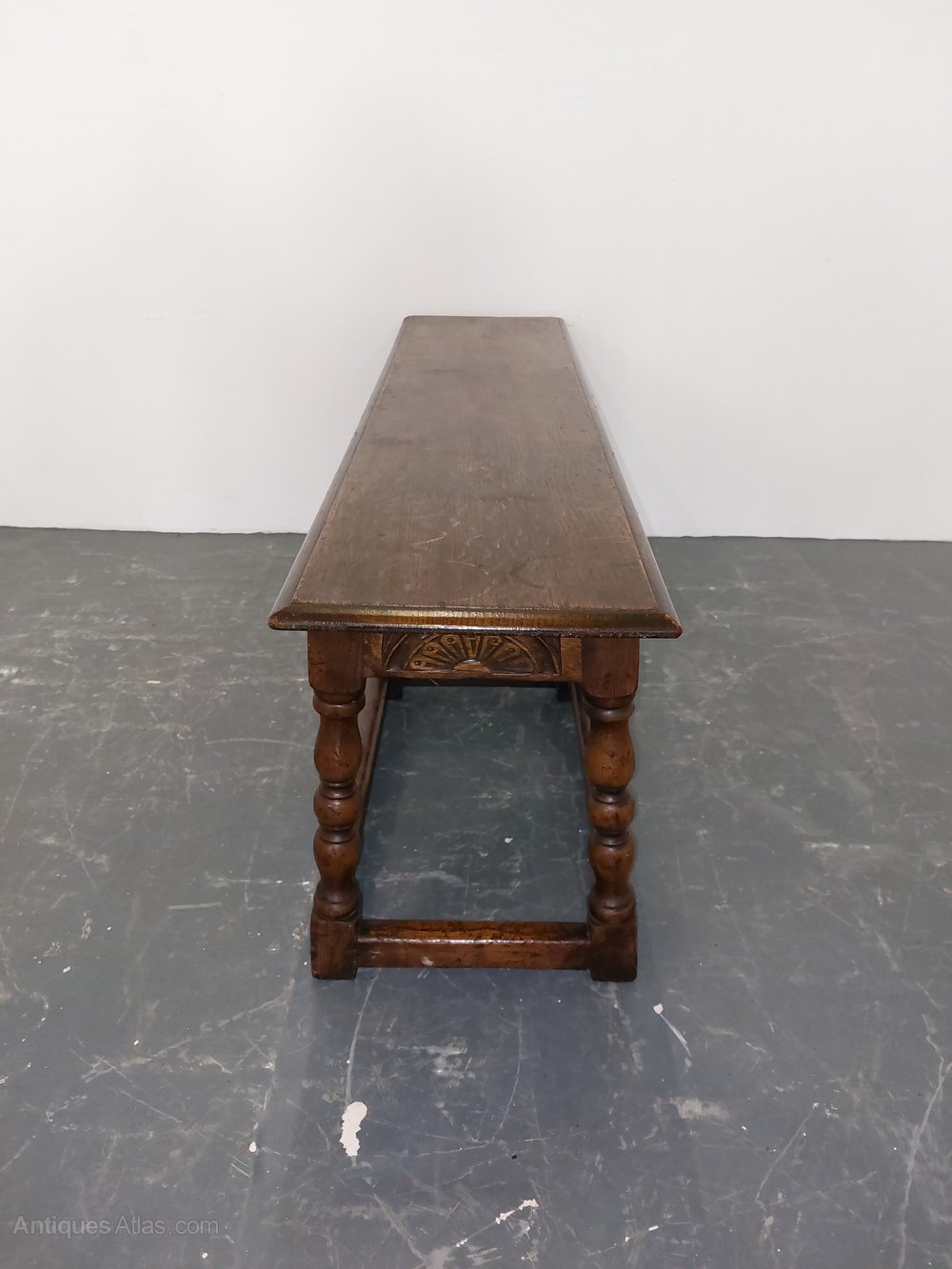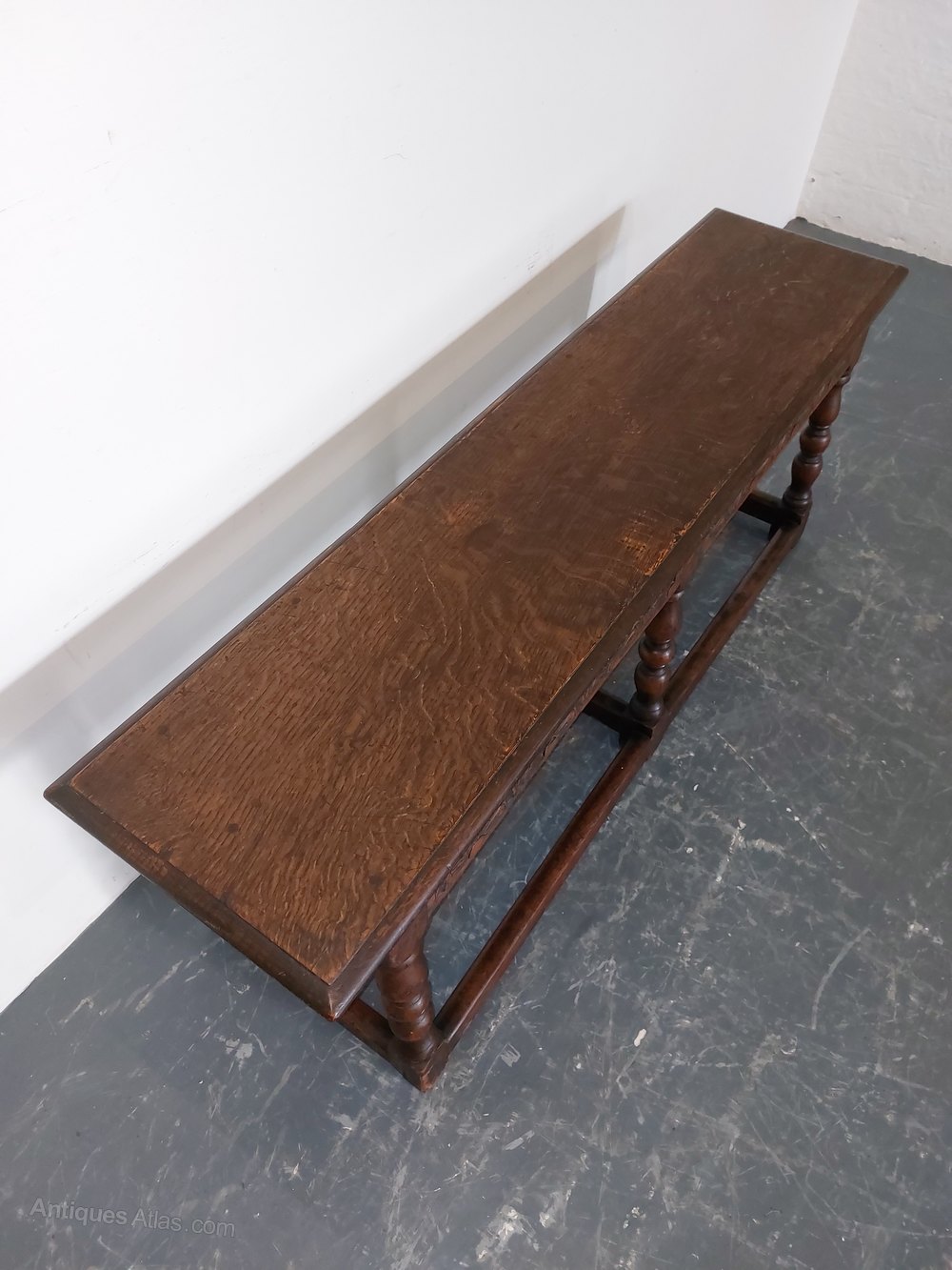 A very nice quality aged oak long low joint stool. Dating to the early 1900s unusually standing on six turned legs with stretchers all around making this stool very strong and firm. Carved frieze under the top compliments this stool. A period looking joint stool (17th century) but dating to the 1900s. Will make a perfect window or hall seat. Lovely colour and patina. 48" wide x 12" deep x 18" high.