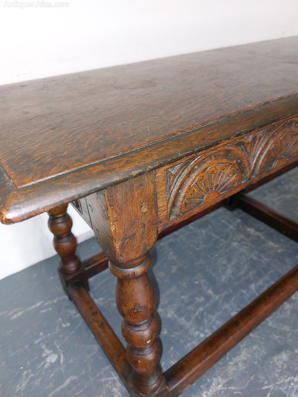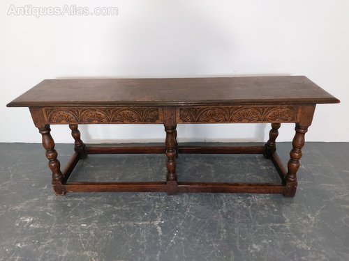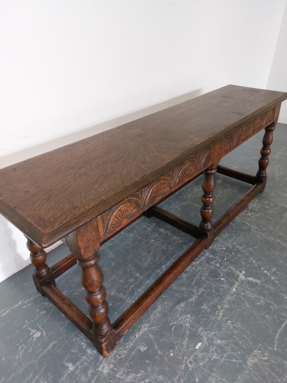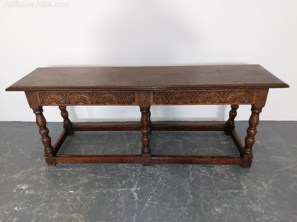 A very nice quality aged oak long low joint stool. Dating to the early 1900s unusually standing on six turned legs with stretchers all around making this stool very strong and firm. Carved frieze under the top compliments this stool. A period looking joint stool (17th century) but dating to the 1900s. Will make a perfect window or hall seat. Lovely colour and patina. 48" wide x 12" deep x 18" high.
