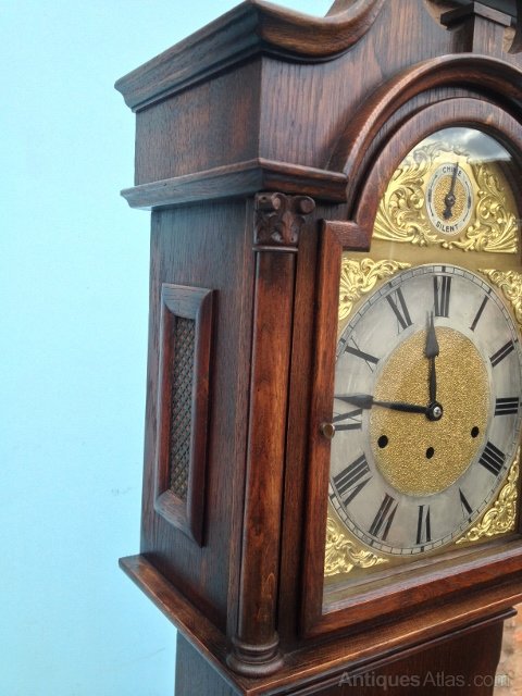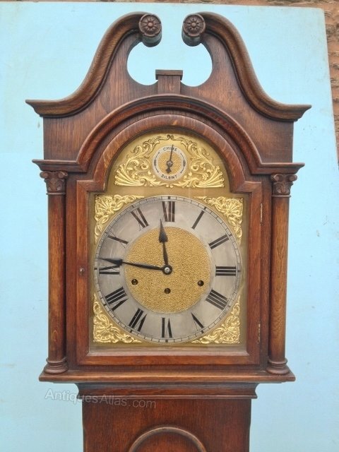 Stunning Oak Longcase antique clock from the c 1920.s with brass and silvered ached dial. this clock produces a beautiful chime and is a good timekeeper.