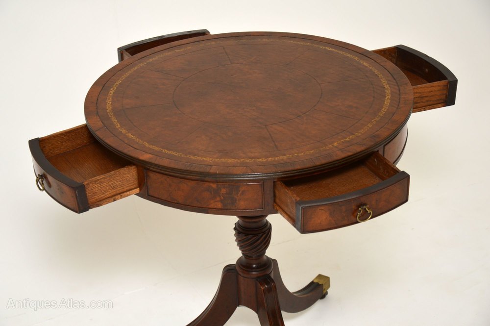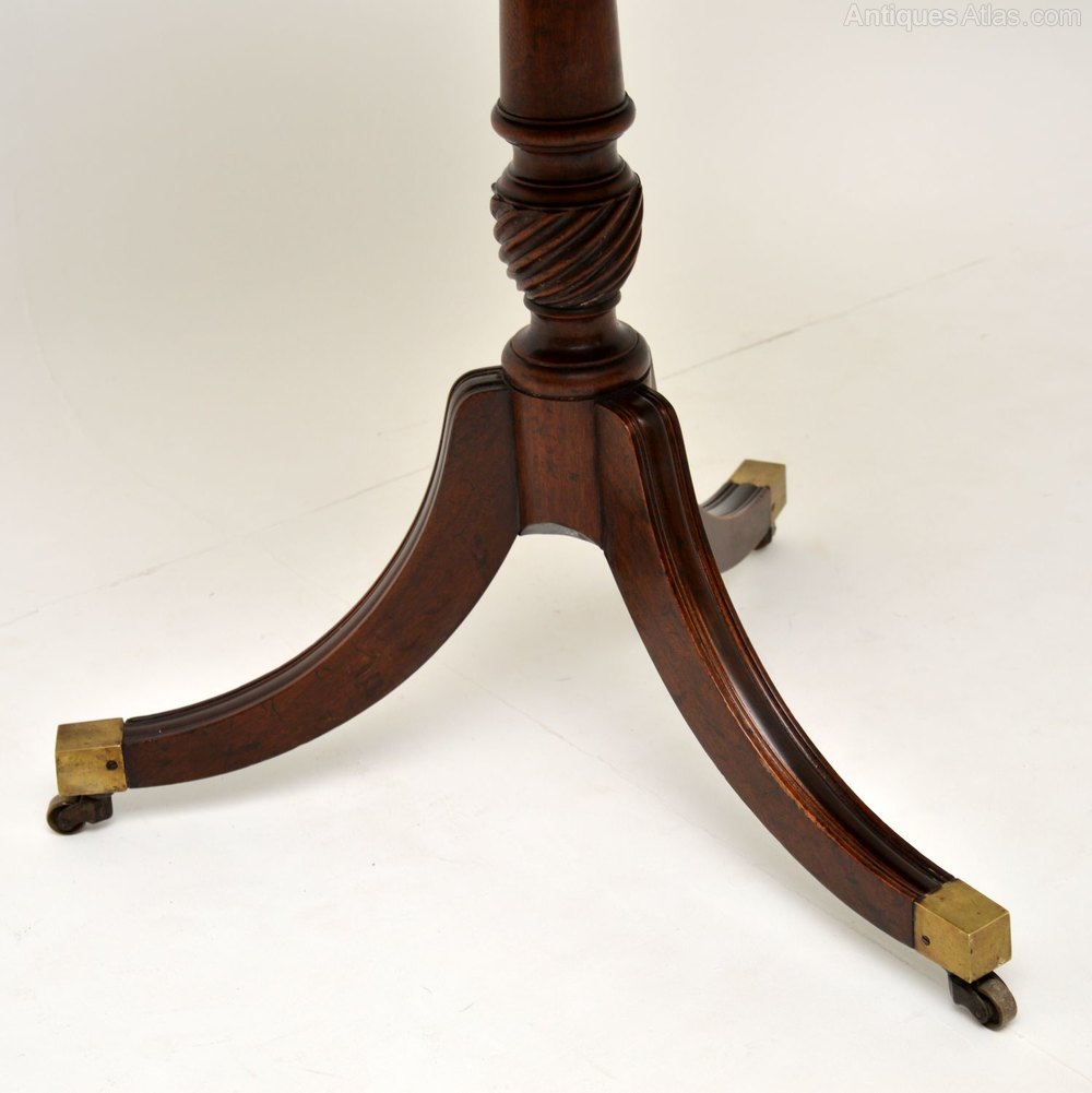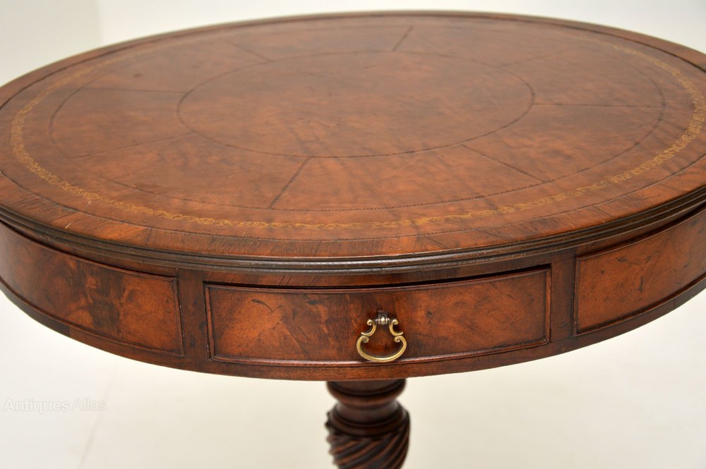 It has a segmented & tooled inset leather top surface, with mahogany cross banding & a reeded top edge. There are four drawers with original brass drop handles & panels in-between. The top revolves on a turned baluster column, which also has a twist pattern on part of it. This sits on tripod legs with brass capped casters.